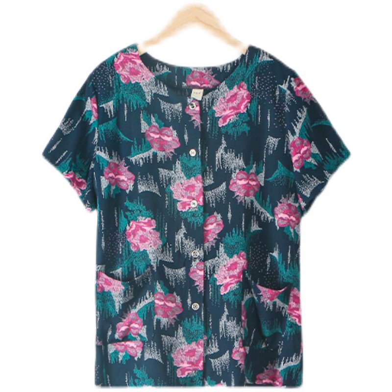夏季中老年女款棉绸薄款圆领印花短袖开衫上衣宽松简约外穿睡衣