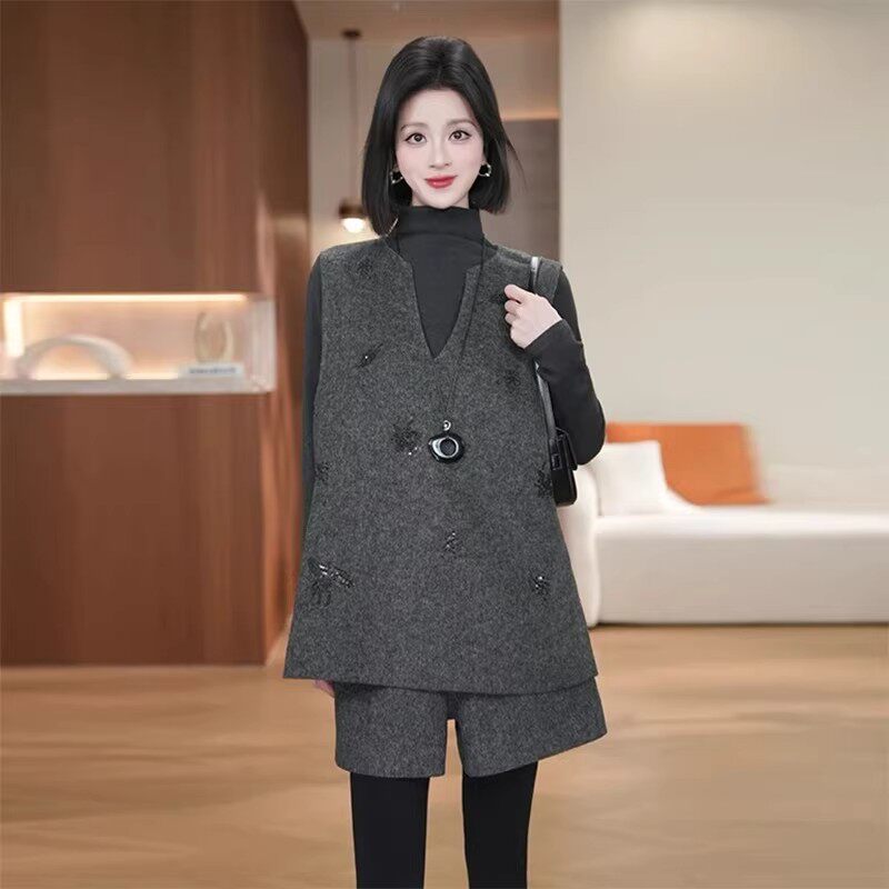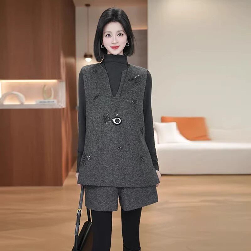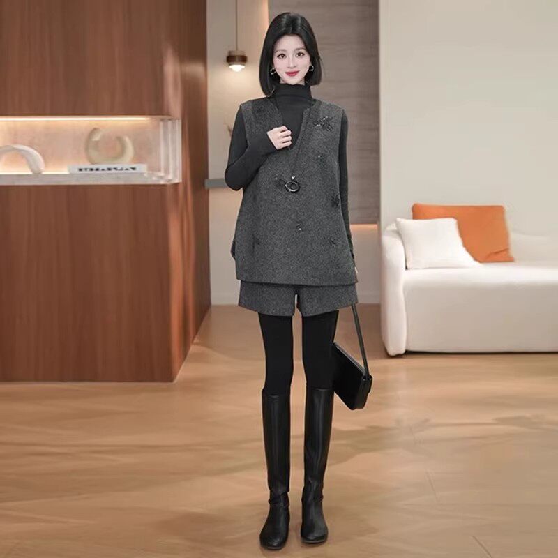 巨好看冬装一整套装女士2026新款小个子气质马甲打底衫短裤三件套