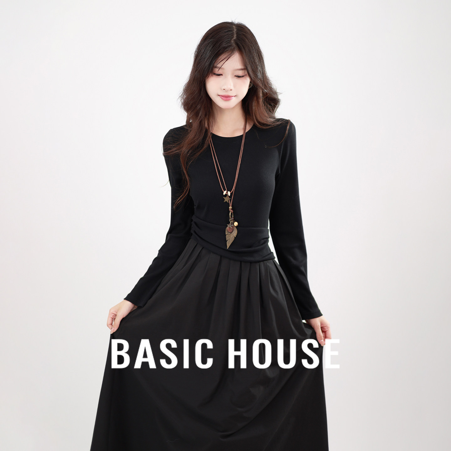 Basic House/百家好法式赫本风黑色长袖连衣裙子女装春季气质显瘦