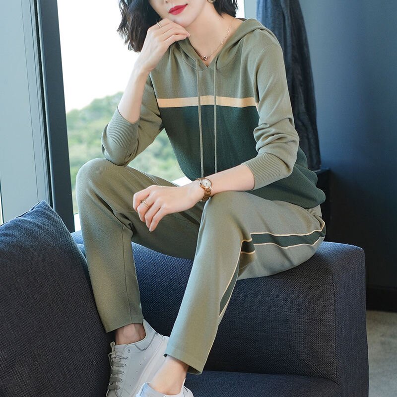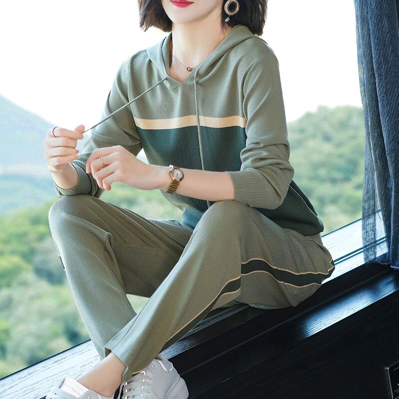休闲时尚运动服套装女春季中年妈妈装针织冰丝洋气减龄两件套卫衣