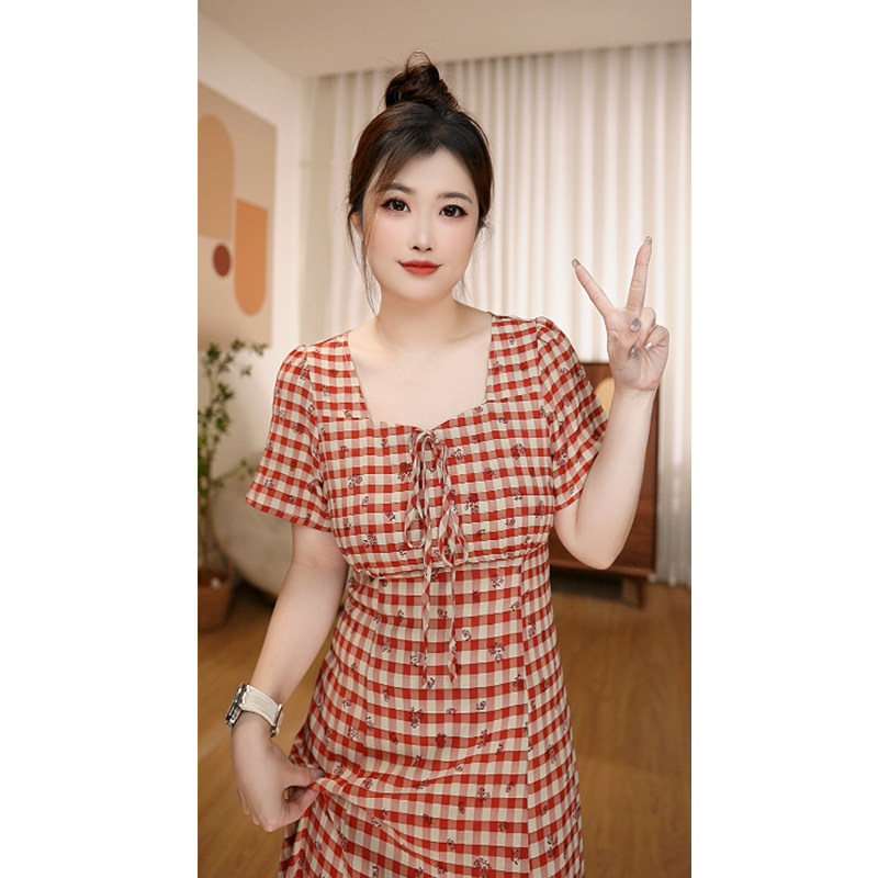 《哆啦》夏季红色格子日系甜美温柔小众大码女装胖mm连衣裙25133