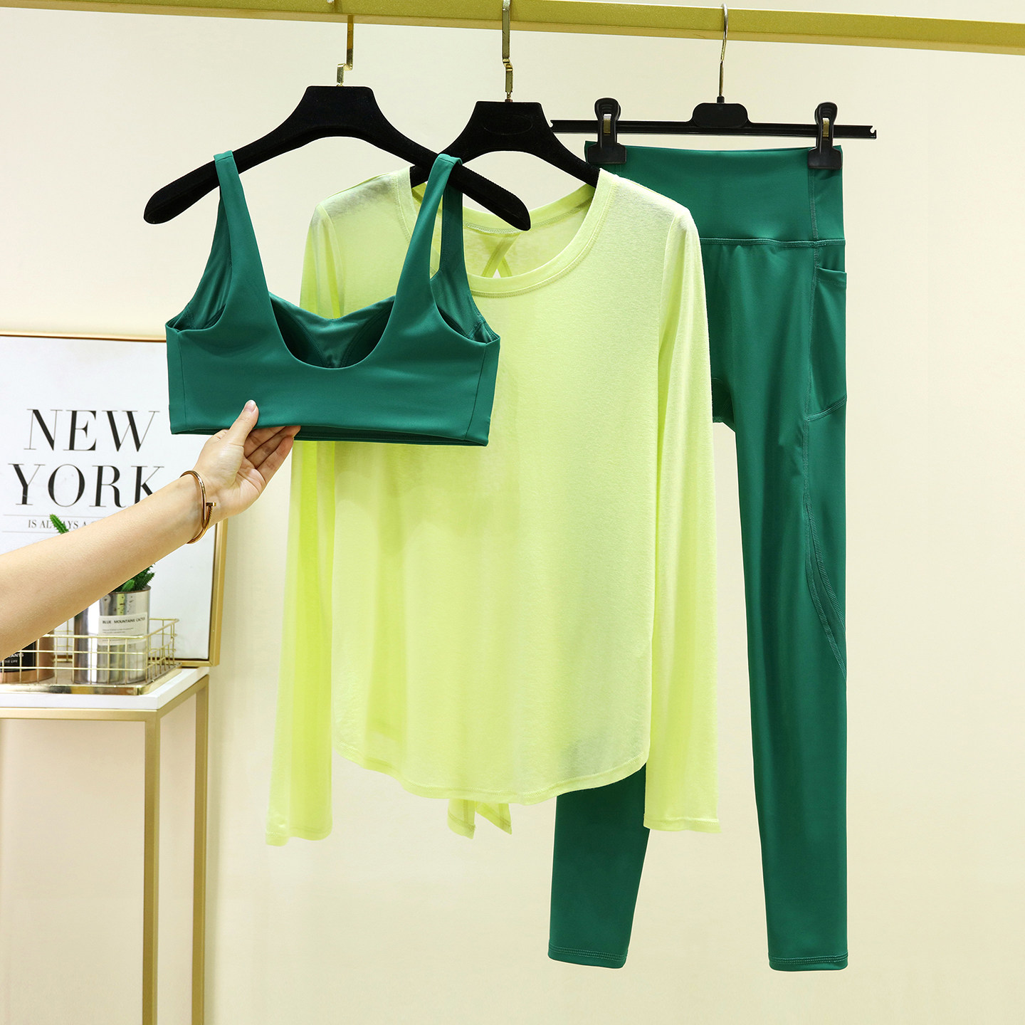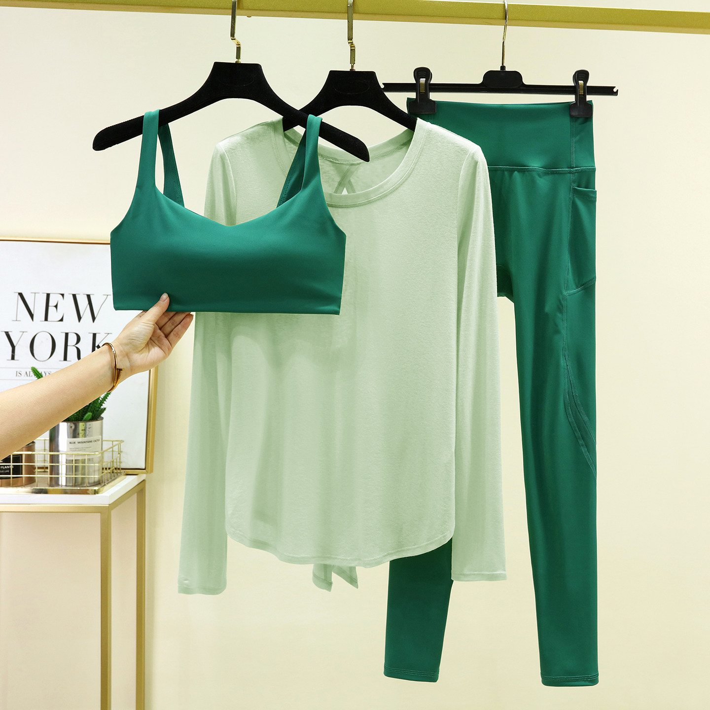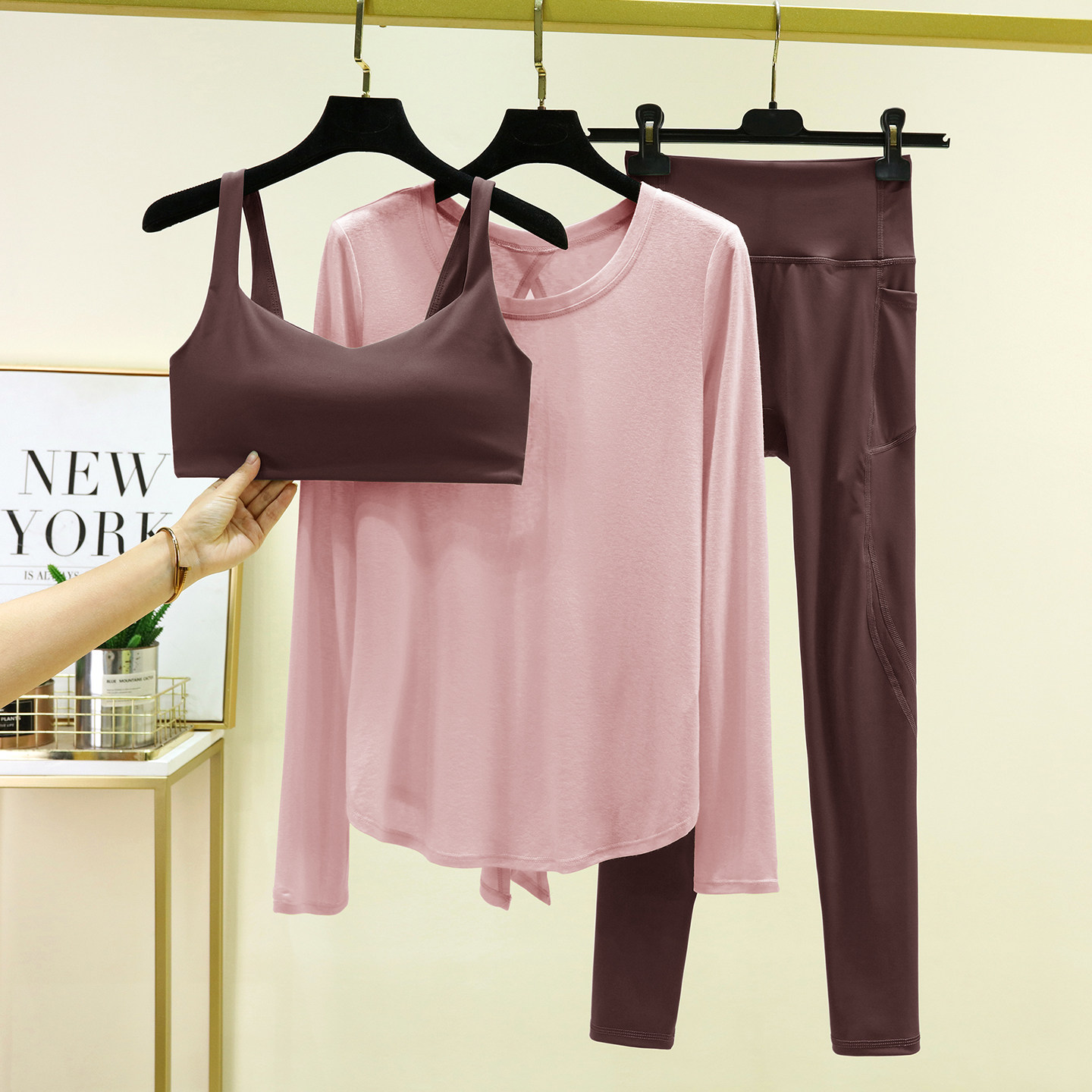 可外穿绝美瑜伽套装扭结美背速干运动长袖女士健身房训练服三件套