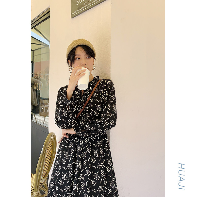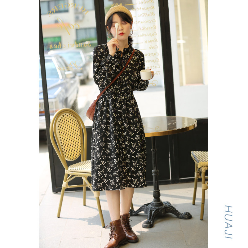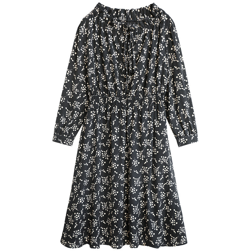 花吉黑色雪纺碎花春装连衣裙女轻熟风收腰系带气质春秋长袖Q019