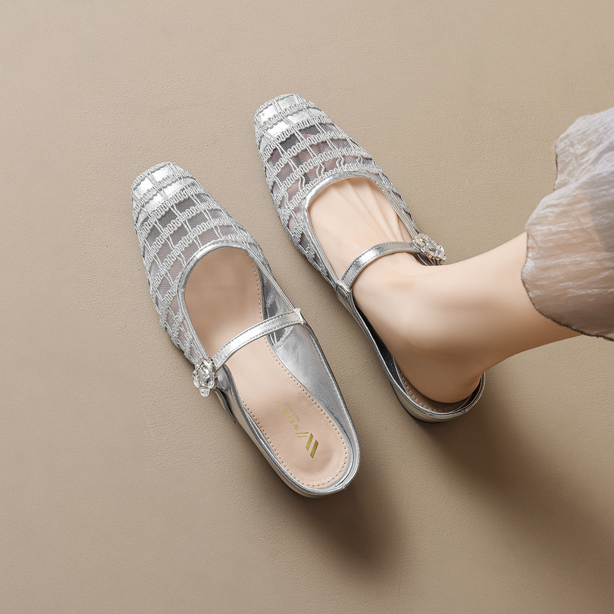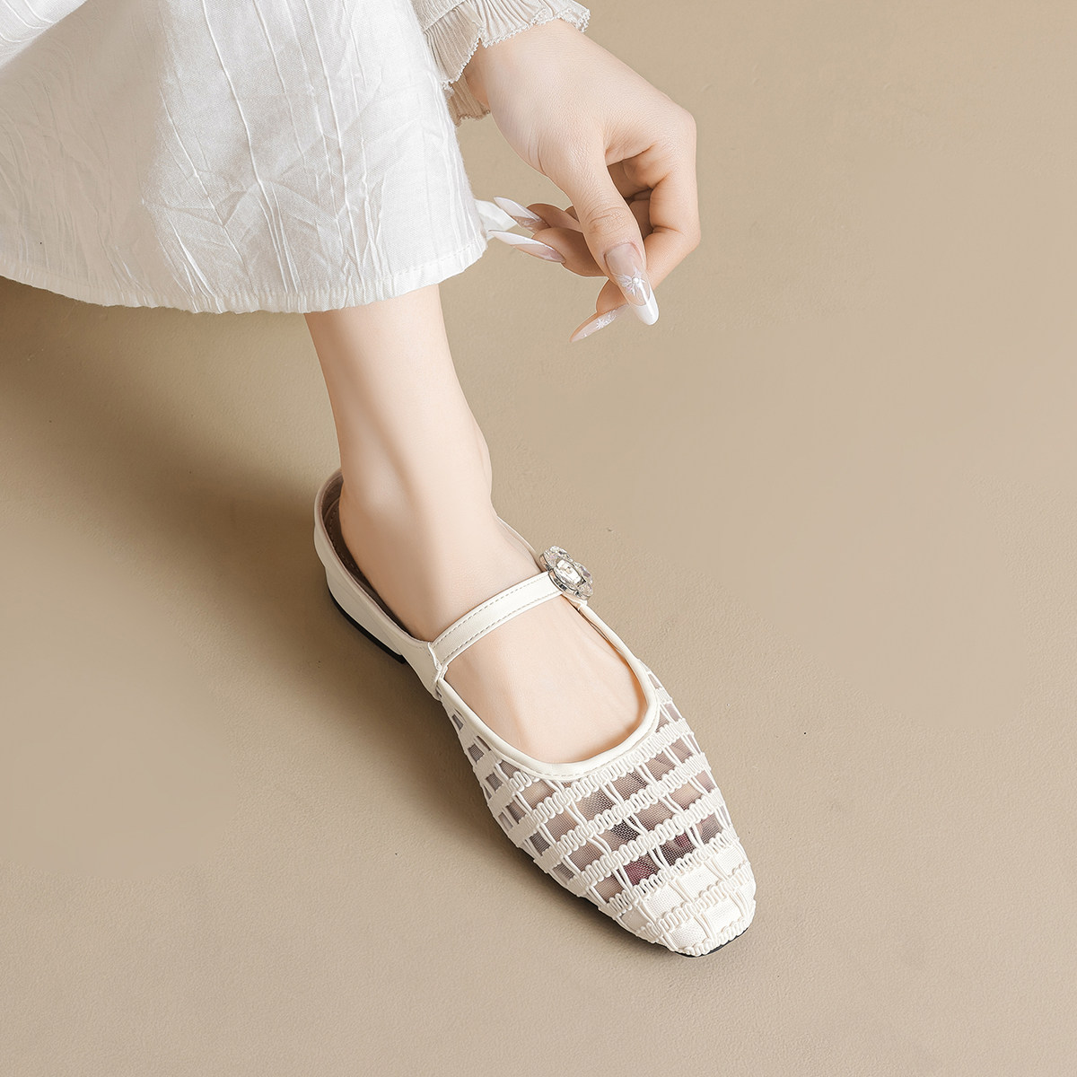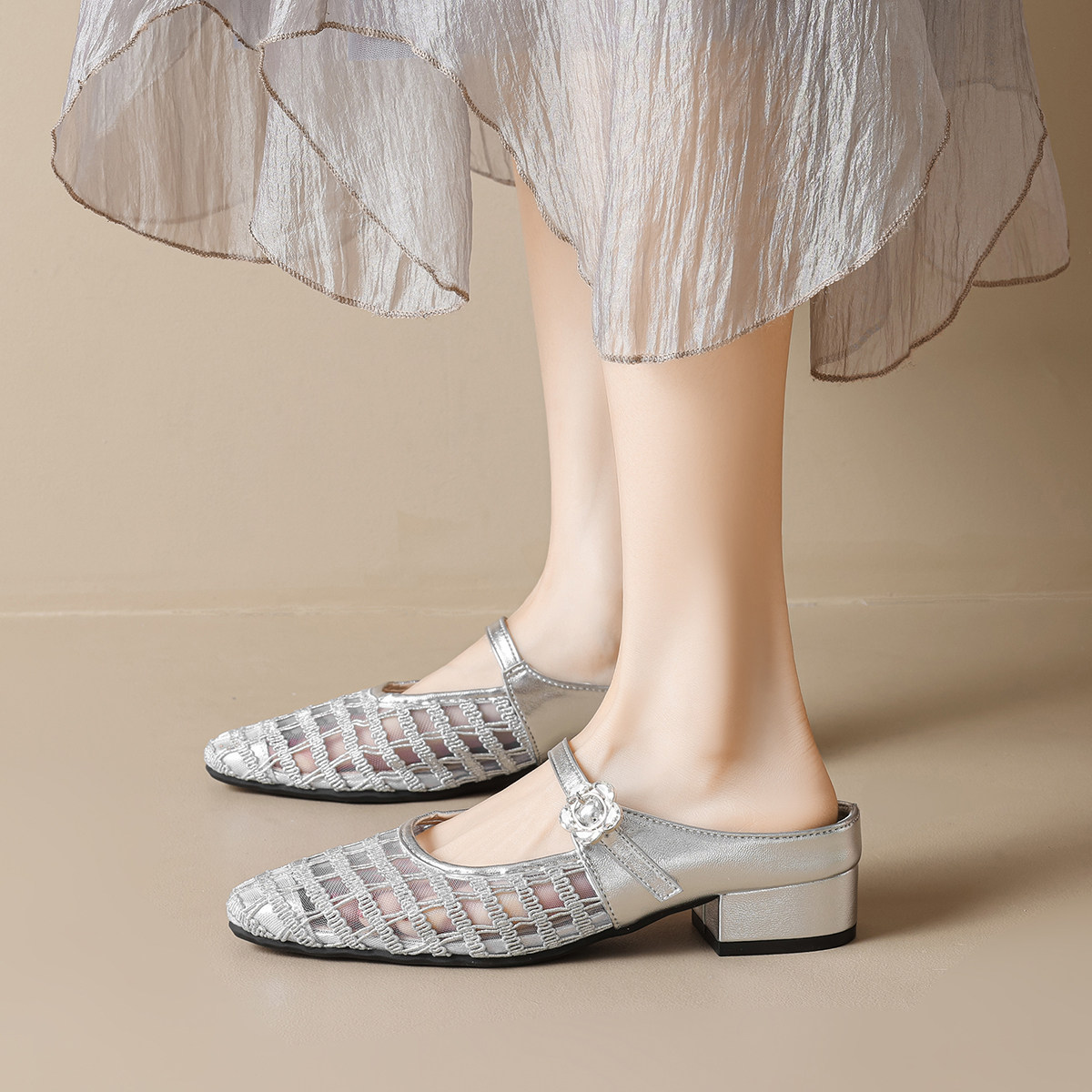方头网纱包头凉鞋女新款2026夏季小香风配裙子镂空半拖大码41一43