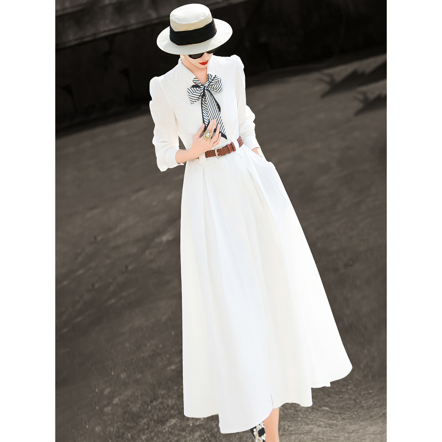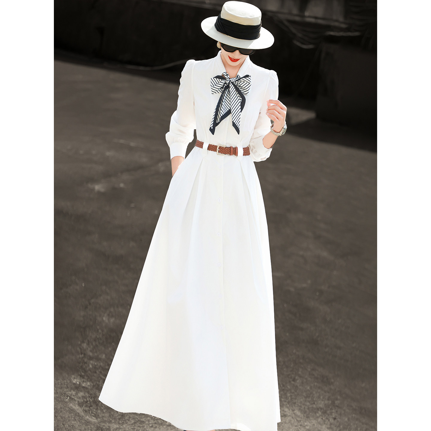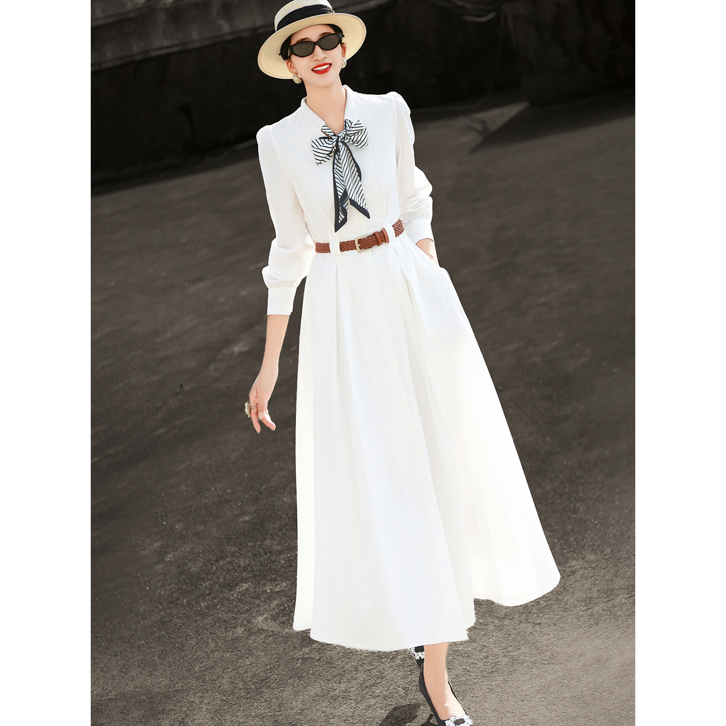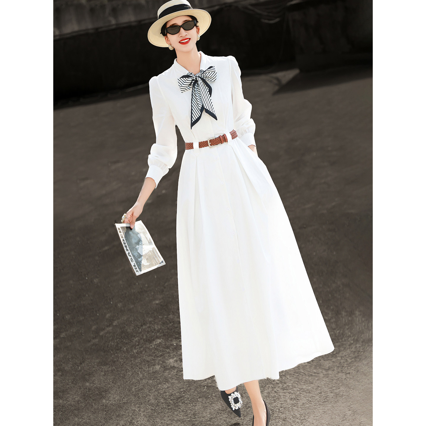 兰瑟儿2026春季新款气质气质通勤蝴蝶结丝巾领白色长袖衬衫连衣裙