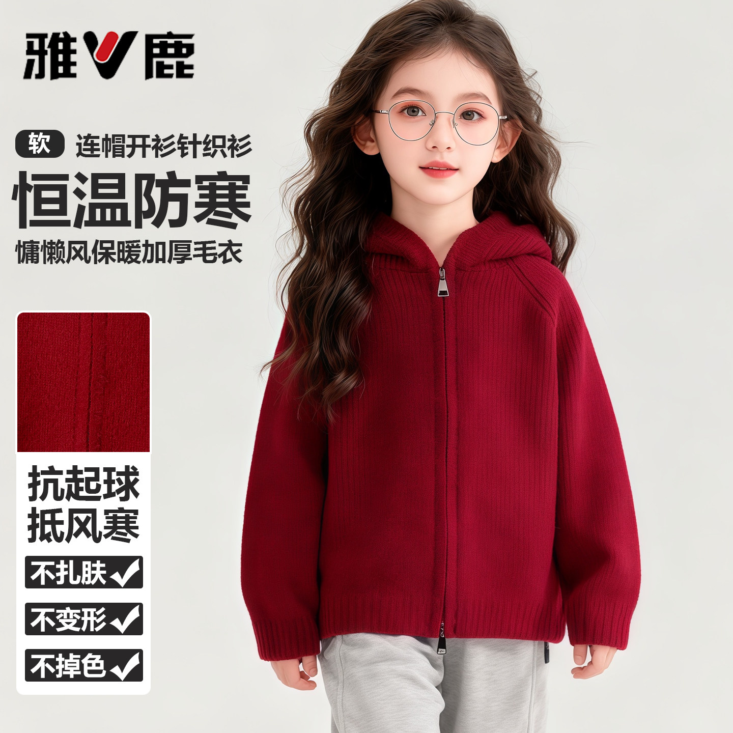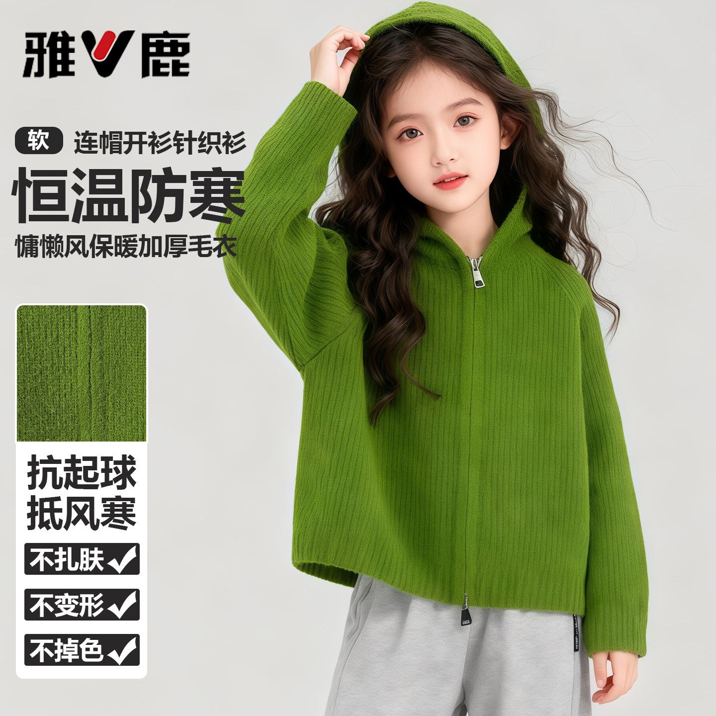 雅鹿儿童外套春上新拉链开衫毛衣2026中大童女孩青少年连帽针织衫