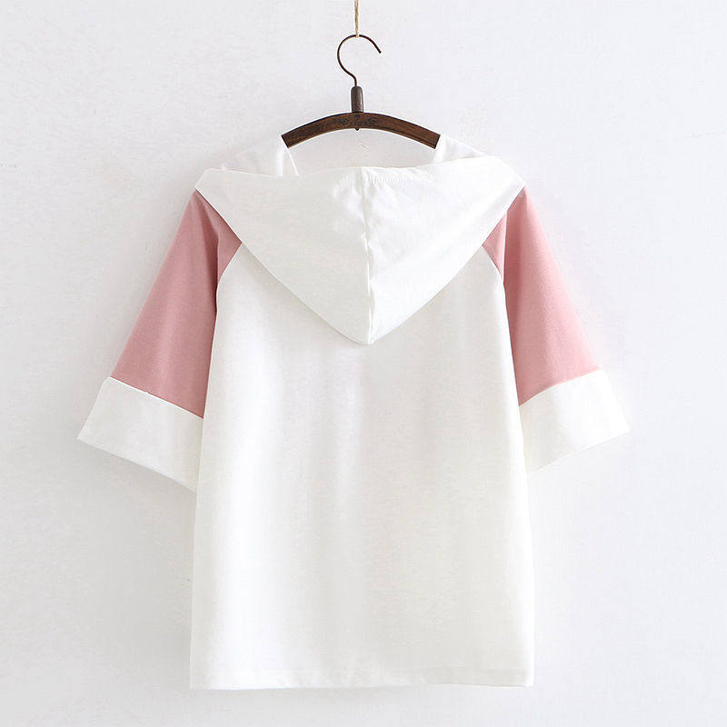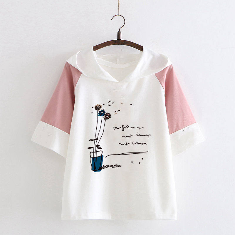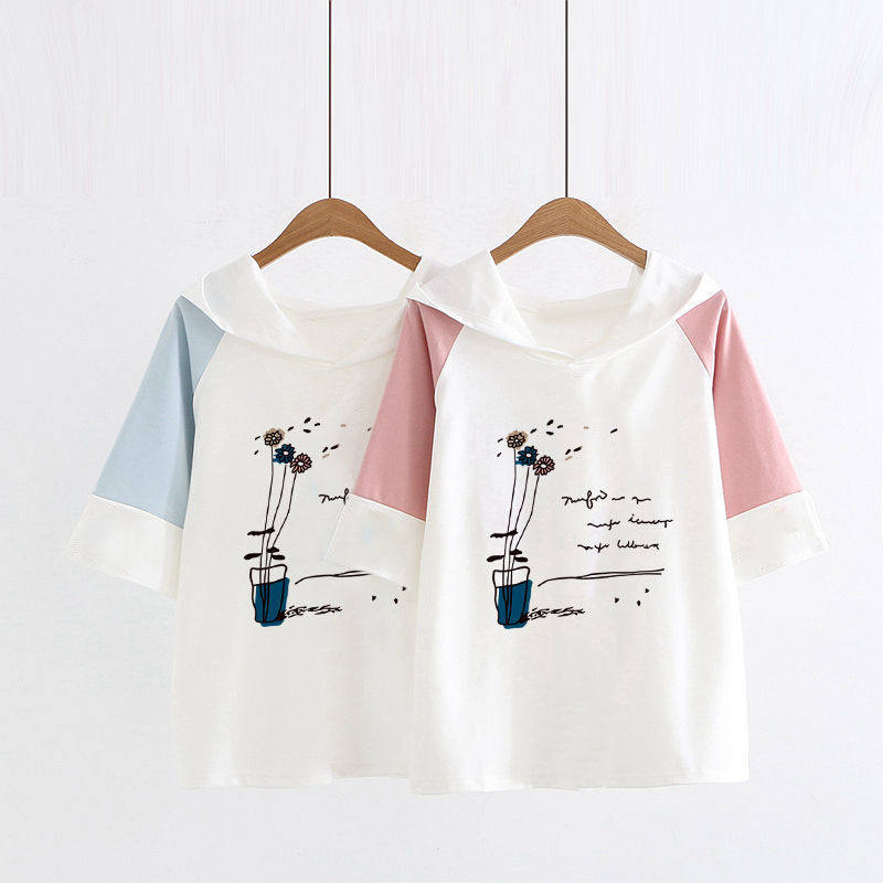 青少年少女初中高中日系夏装短袖T恤学生少女纯棉连帽打底衫上衣