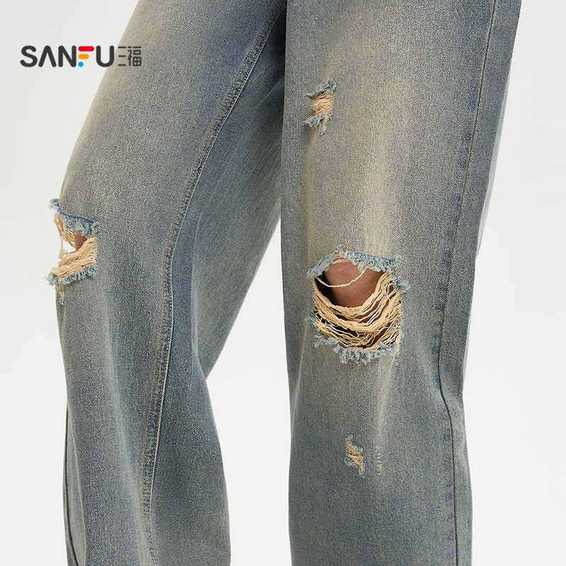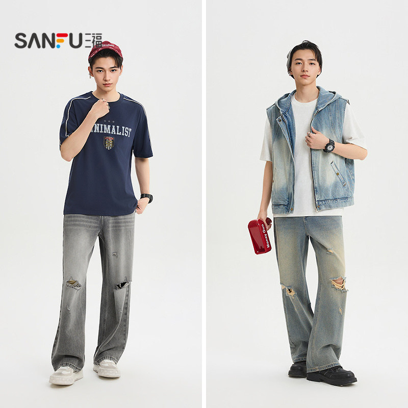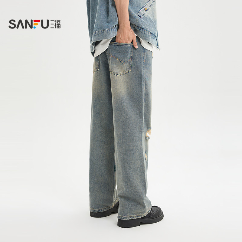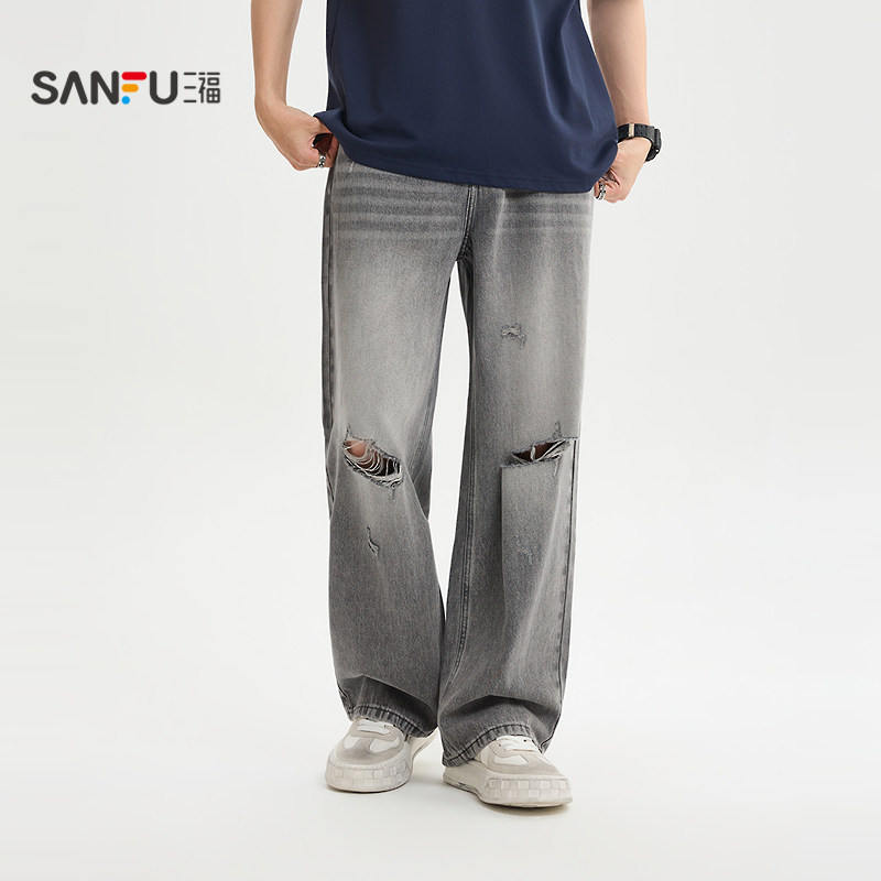 三福2026夏季新款牛仔裤男破洞猫须洗水街头直筒长裤裤子520903