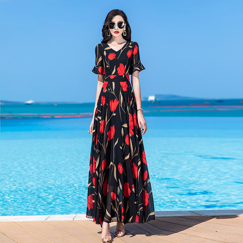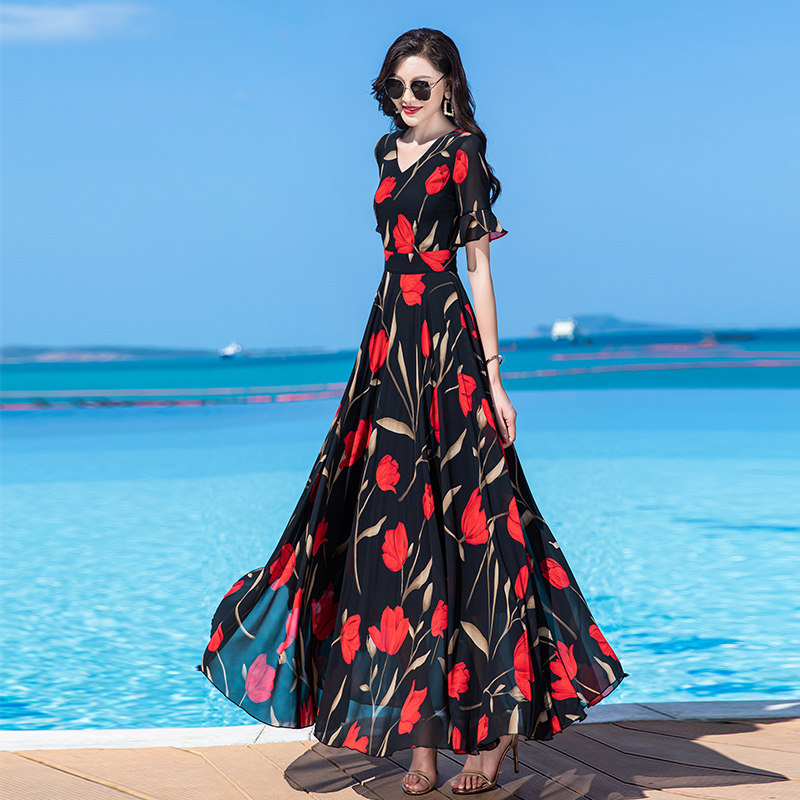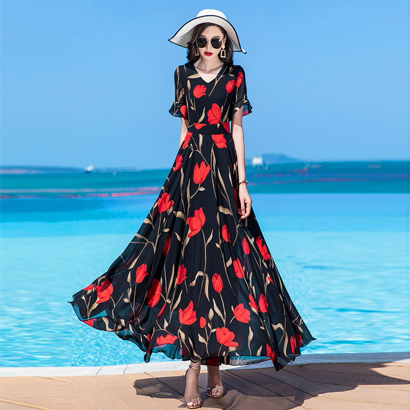连衣裙2025新款雪纺收腰显瘦气质拖地长裙到脚踝高个子超长款女夏