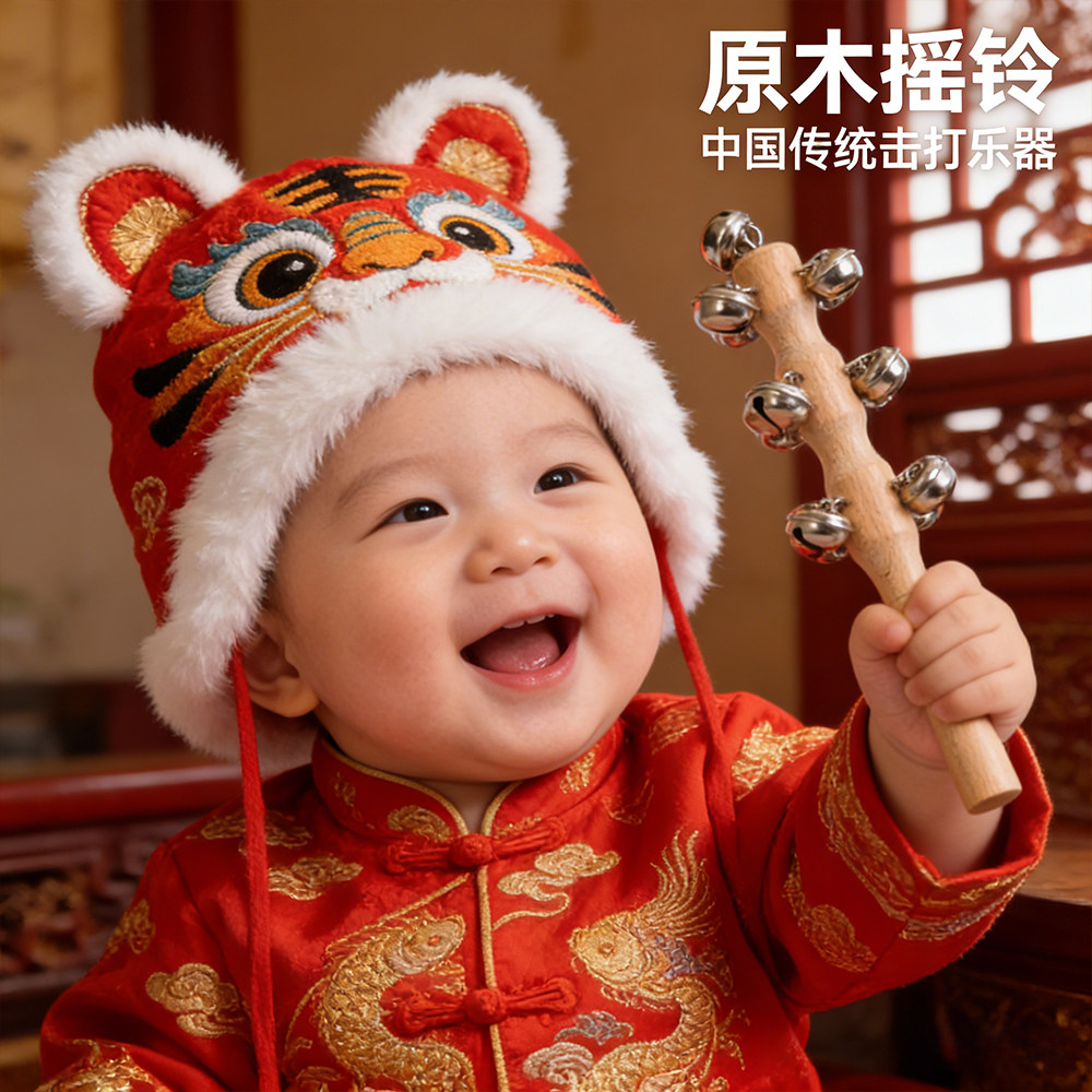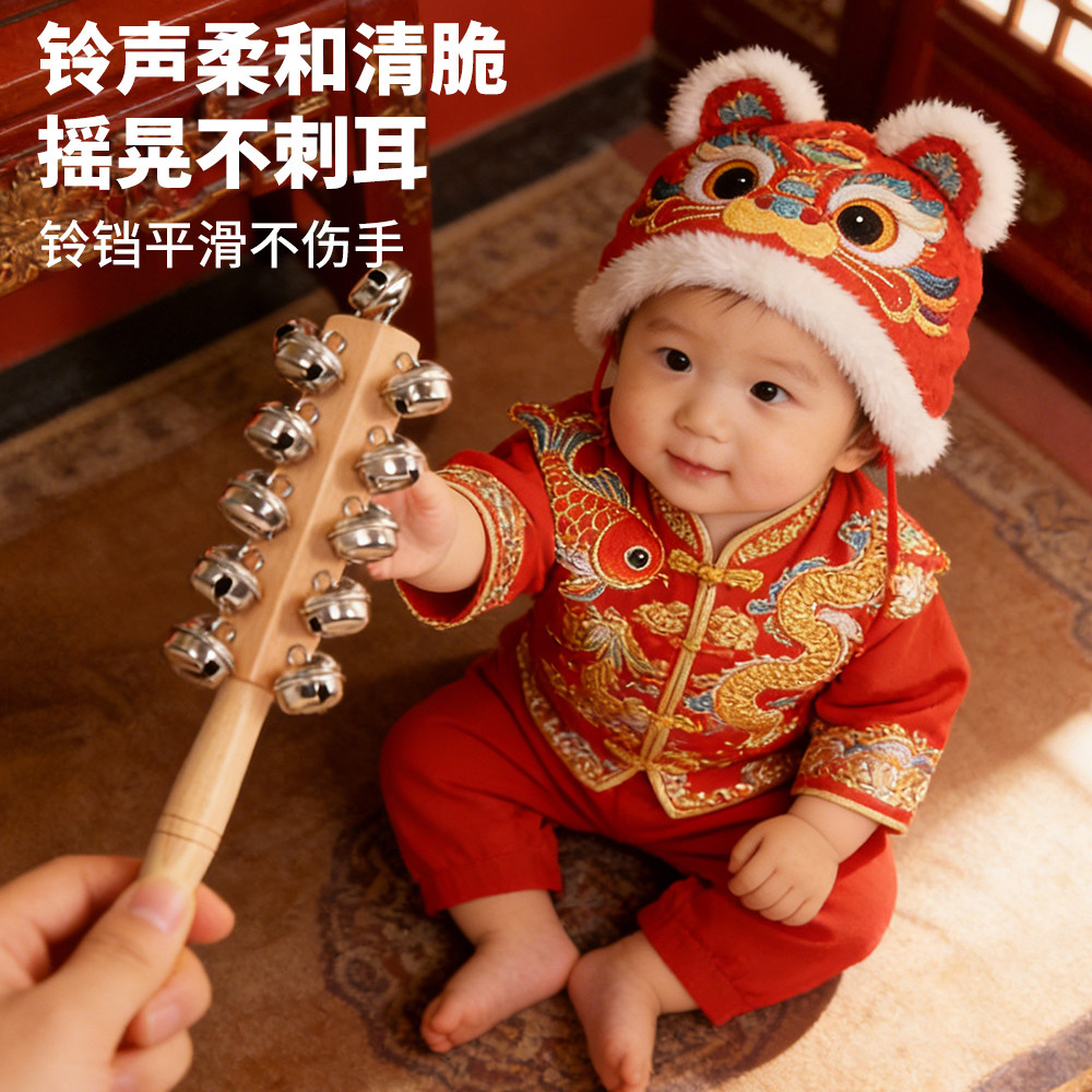 老式手工黄哗啦棒羊皮拨浪鼓和哗啦棒铜婴儿可啃咬婴儿铃铛牛皮