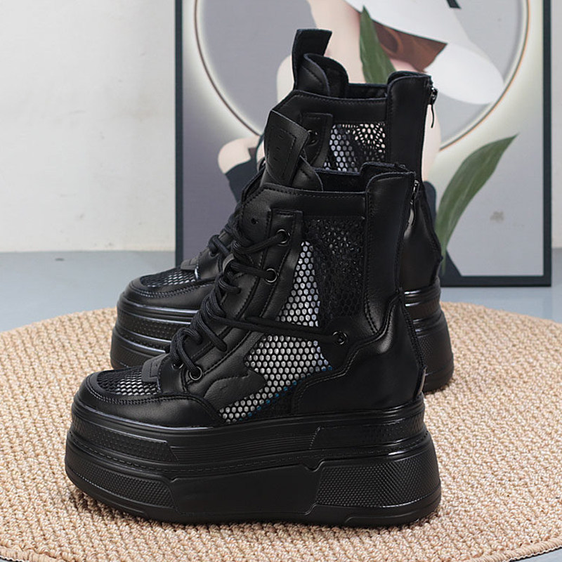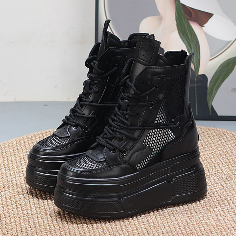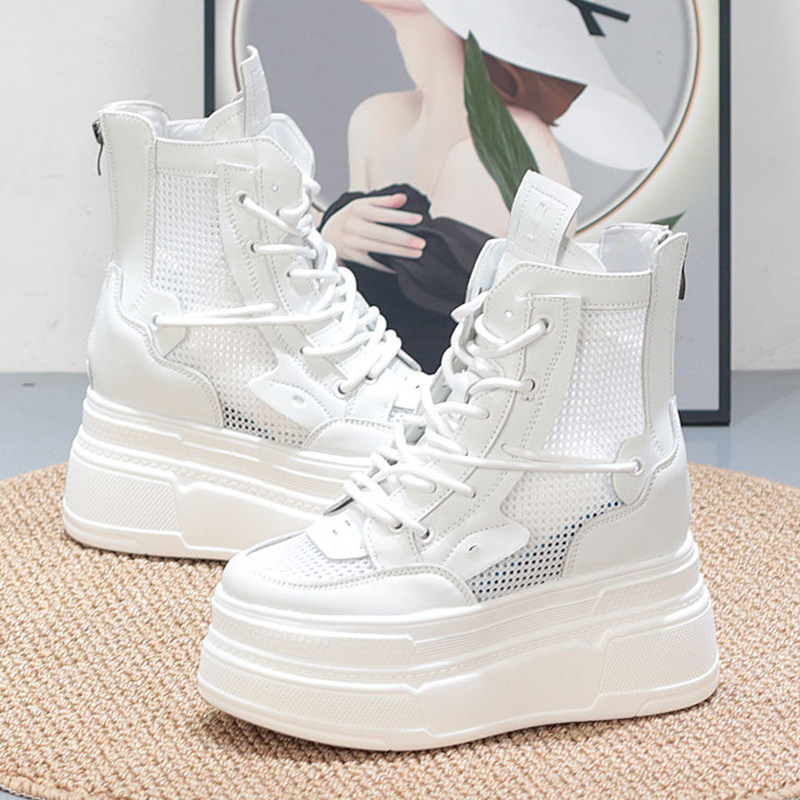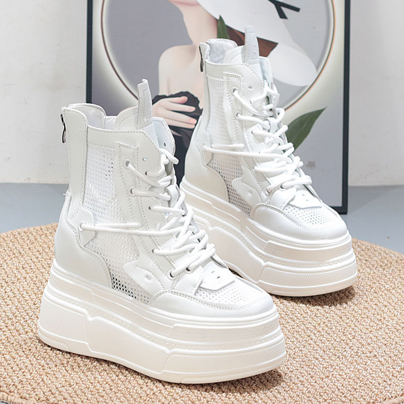 高帮小白鞋女夏内增高12cm小个子显瘦厚底系带网面透气超高跟纯色