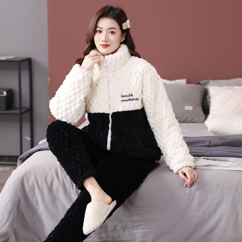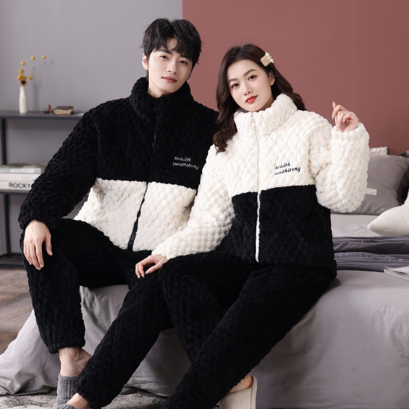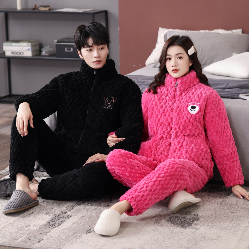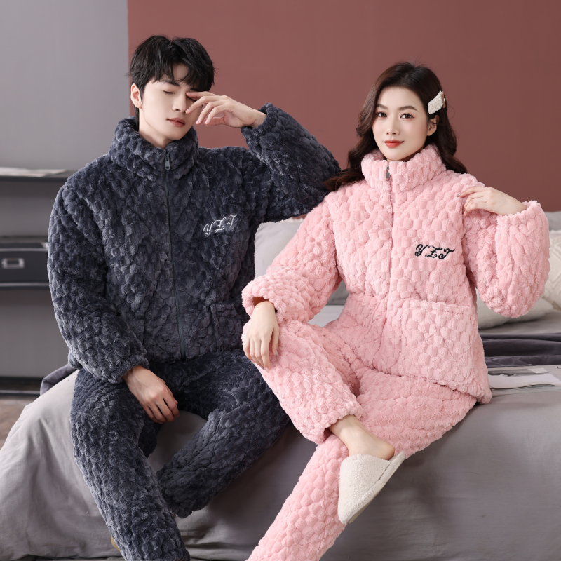 情侣睡衣女冬季法兰绒加绒加厚三层夹棉保暖男款家居服套装可外穿