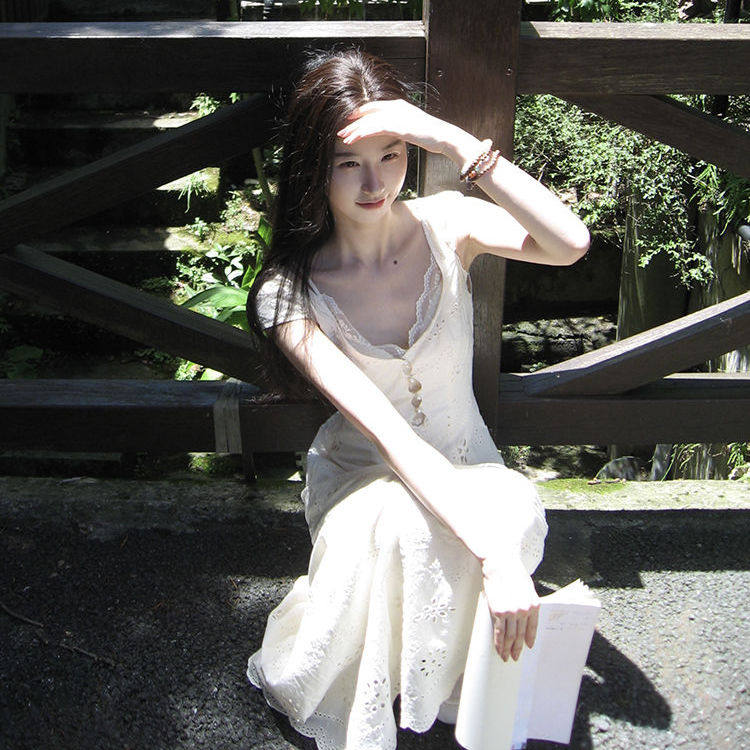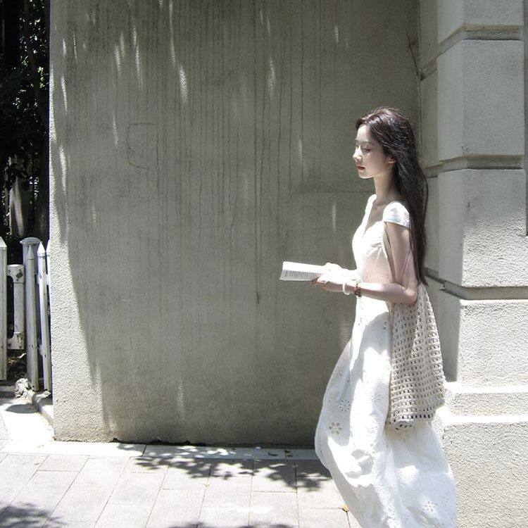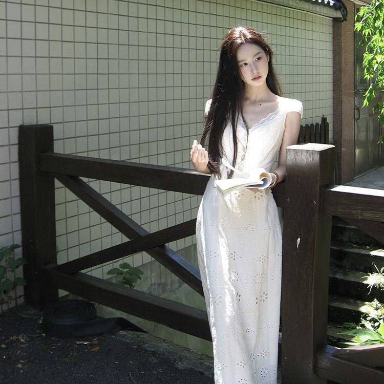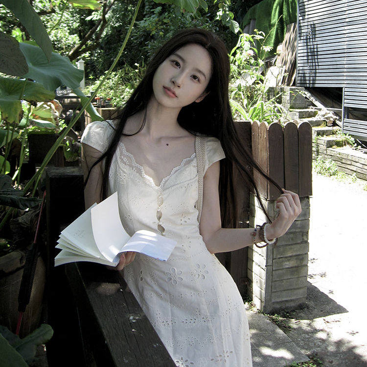蕾丝镂空短袖连衣裙女装夏季法式收腰裙子初恋温柔风a字长裙