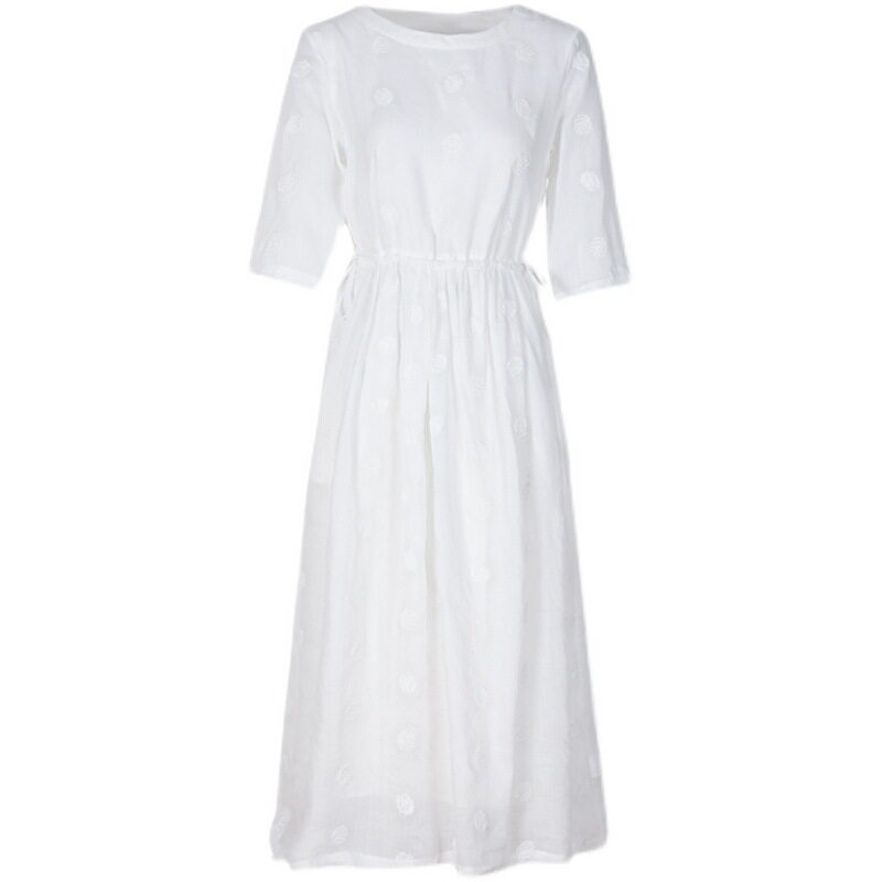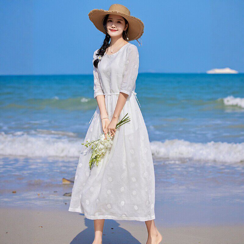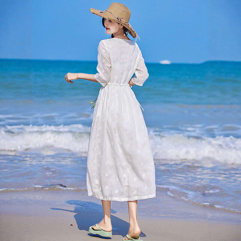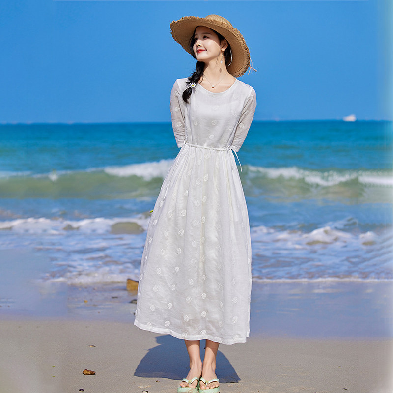 高端白色苎麻刺绣连衣裙女夏复古双层收腰长裙薄款飘逸仙气度假裙