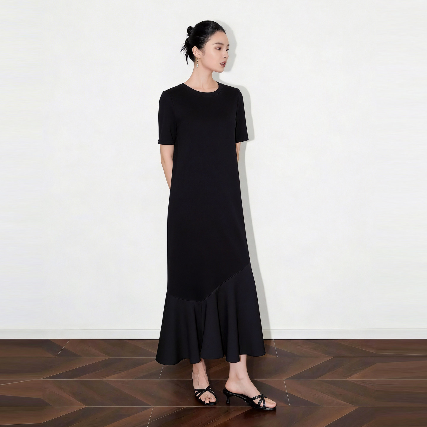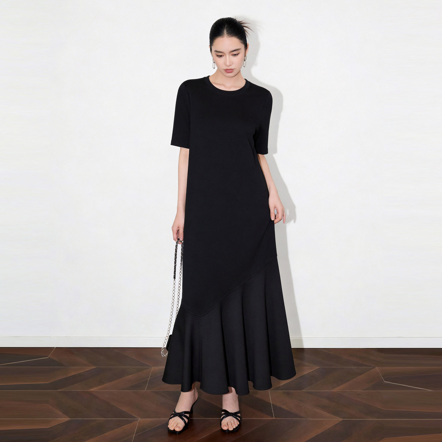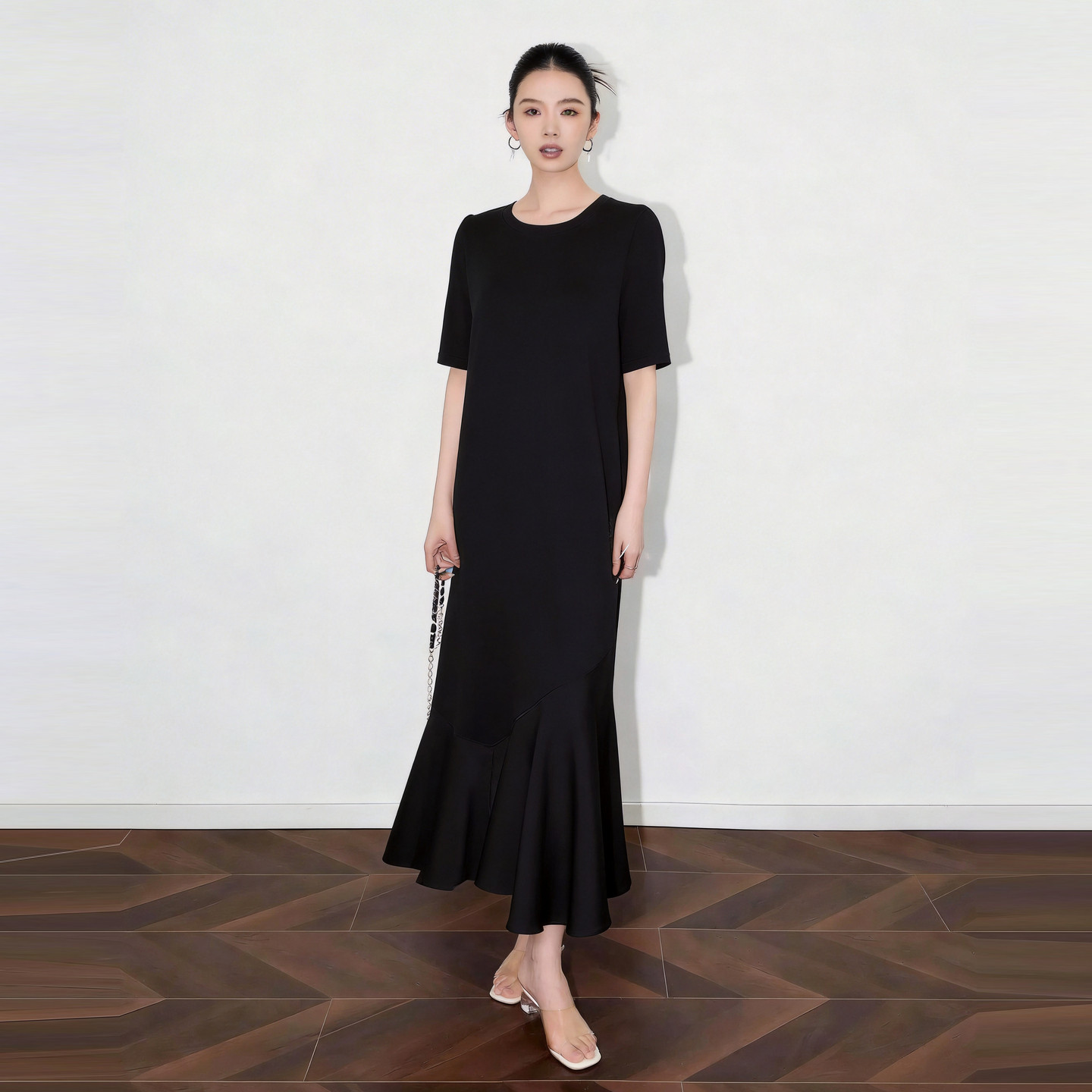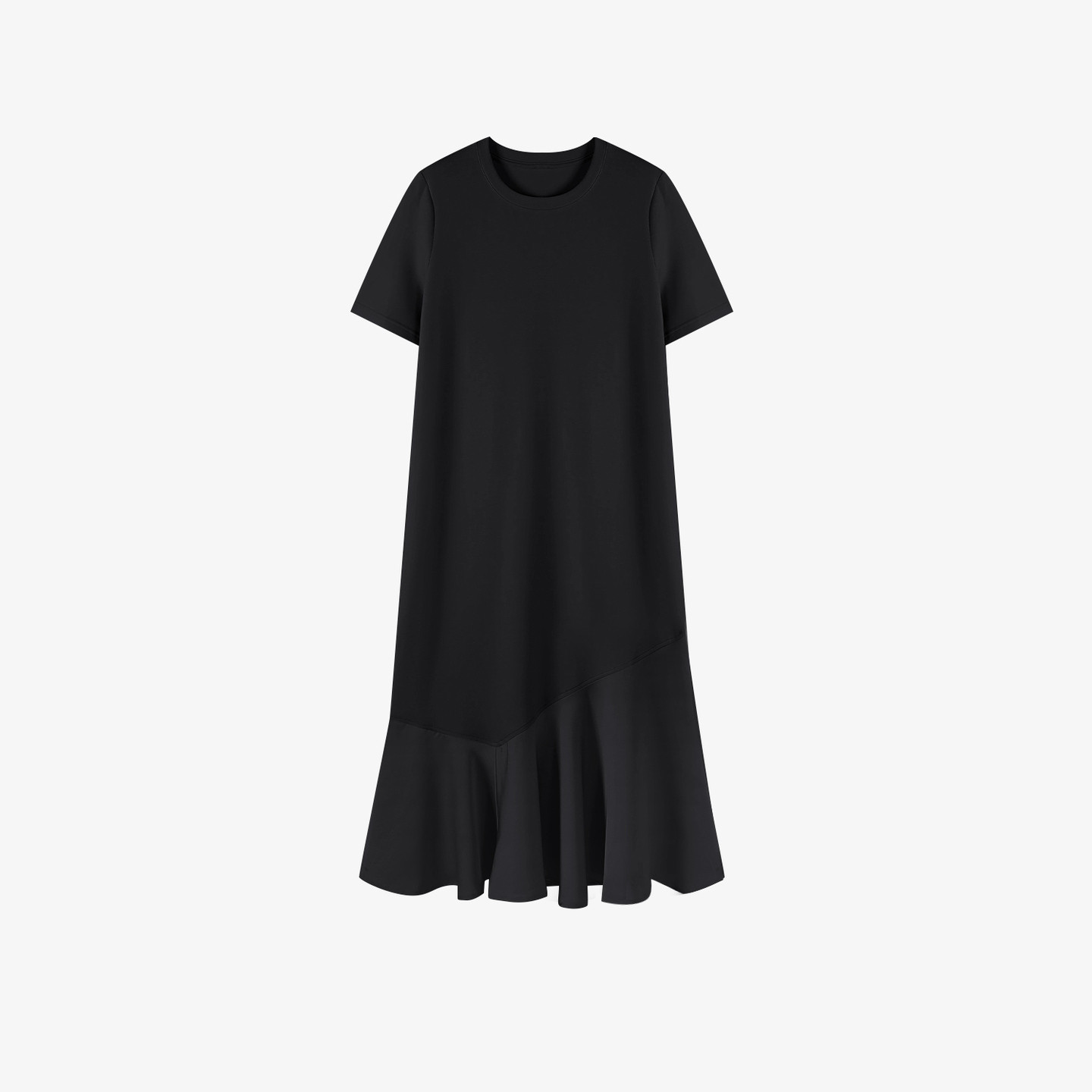 Basic House/百家好黑色连衣裙女2026夏季新款宽松短袖中长款裙子