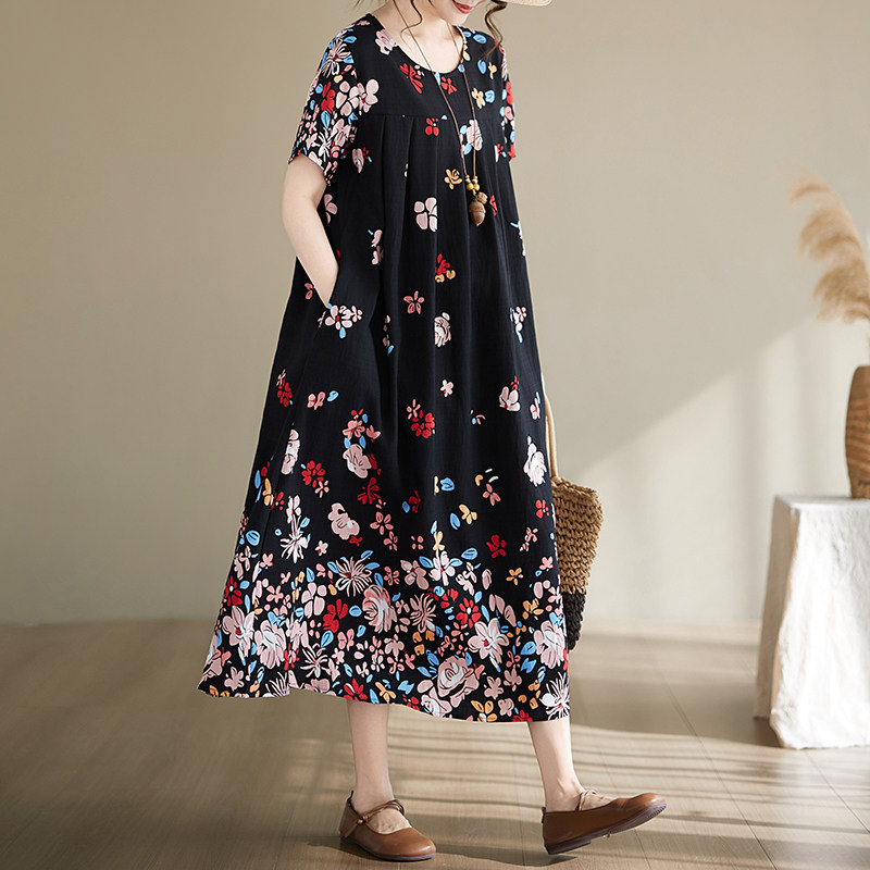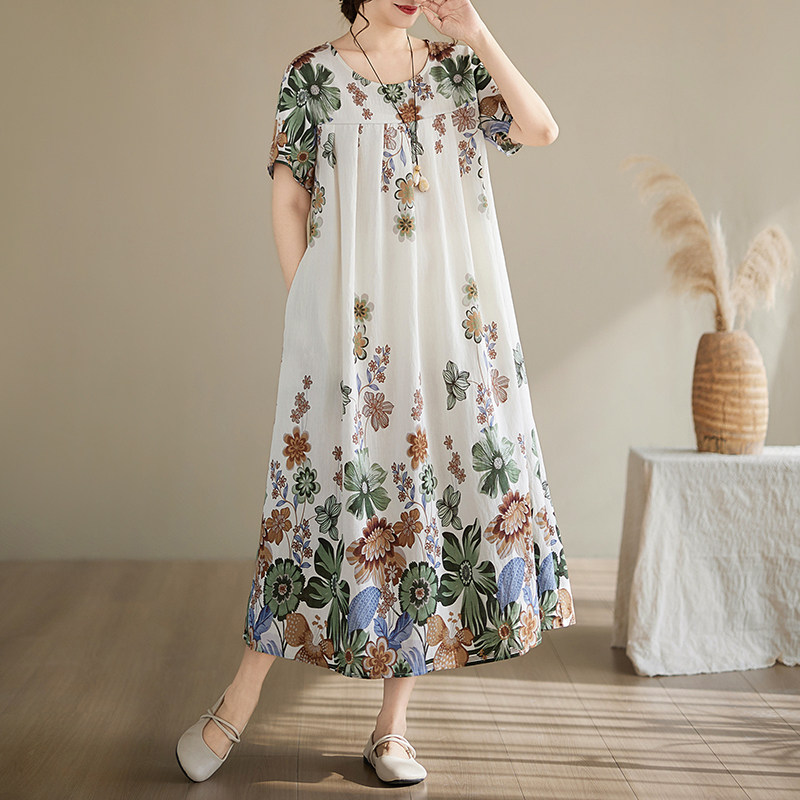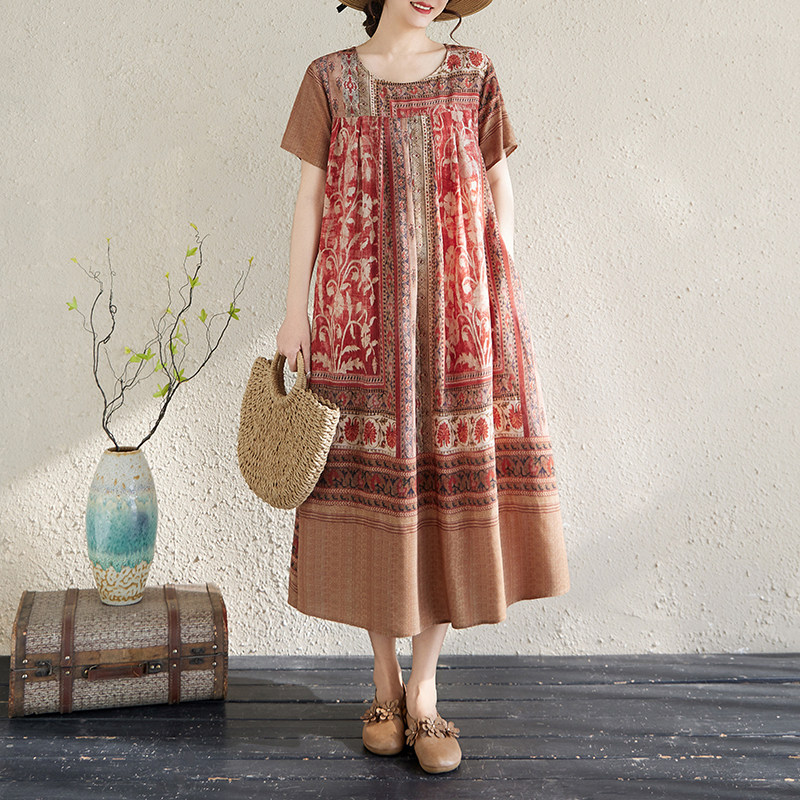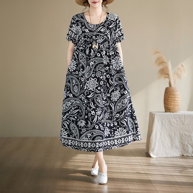2026新款民族风印花棉绸连衣裙女夏季宽松显瘦气质中长款大码裙子
