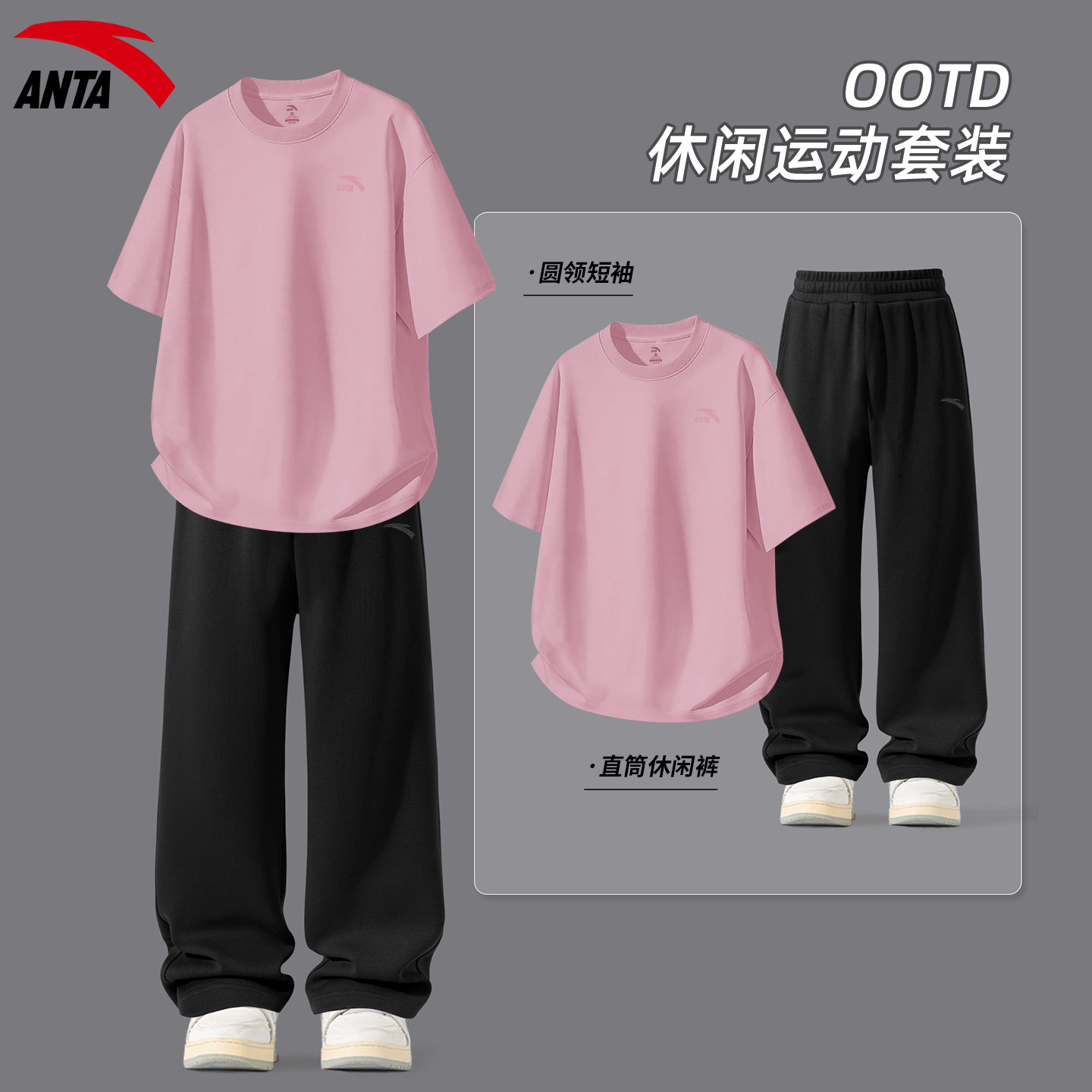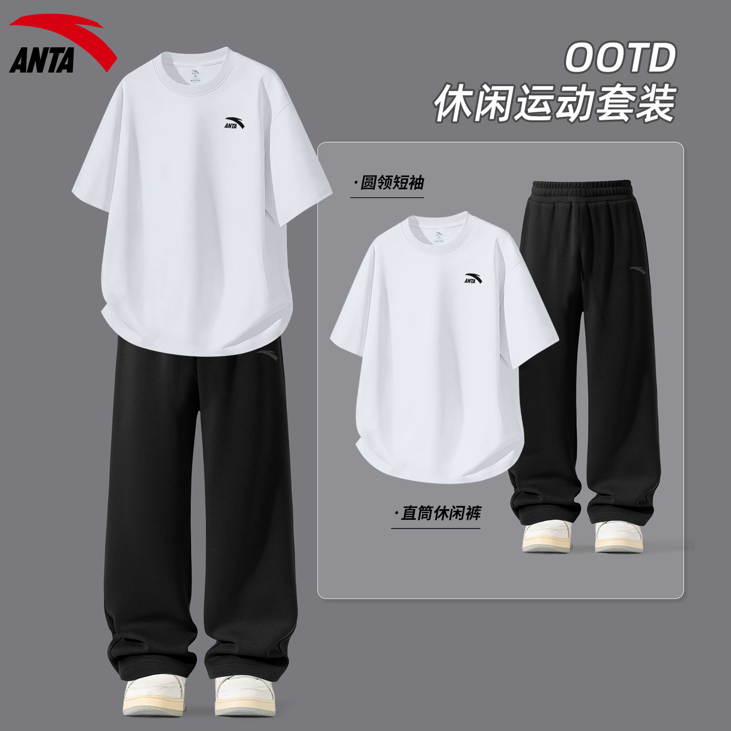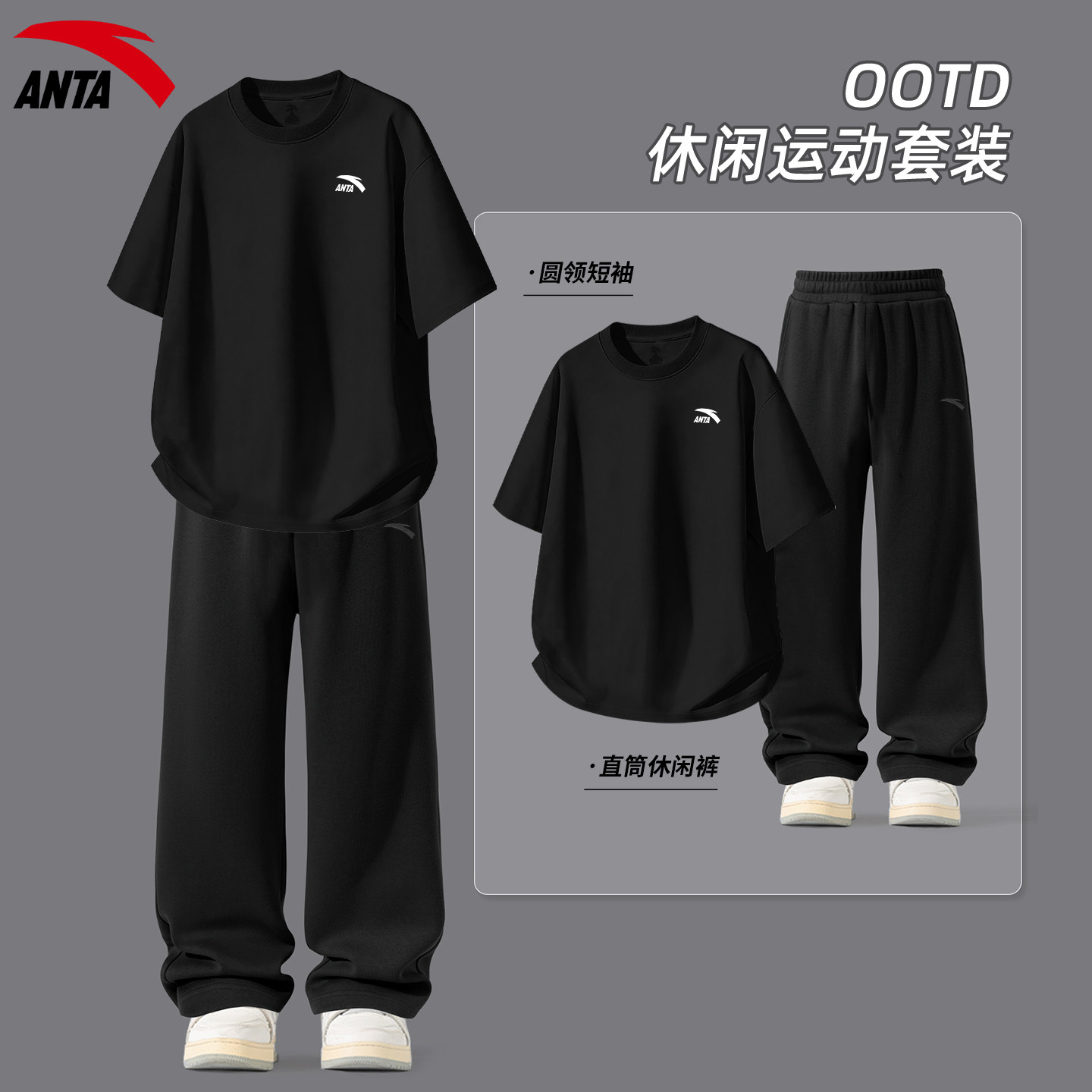 安踏运动套装男生青少年紫色短袖长裤夏季新款潮流美式宽松两件套