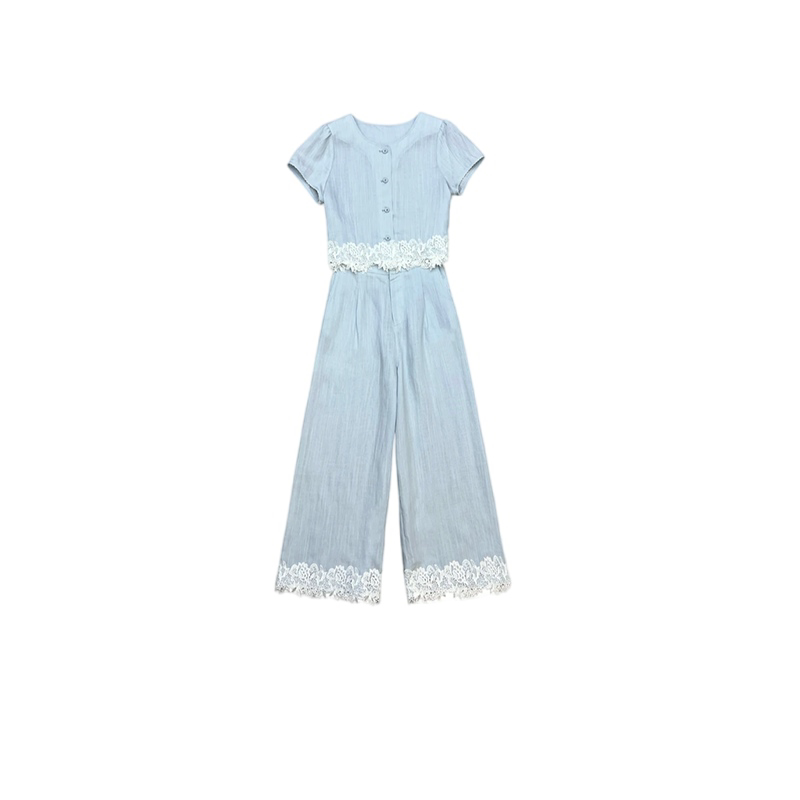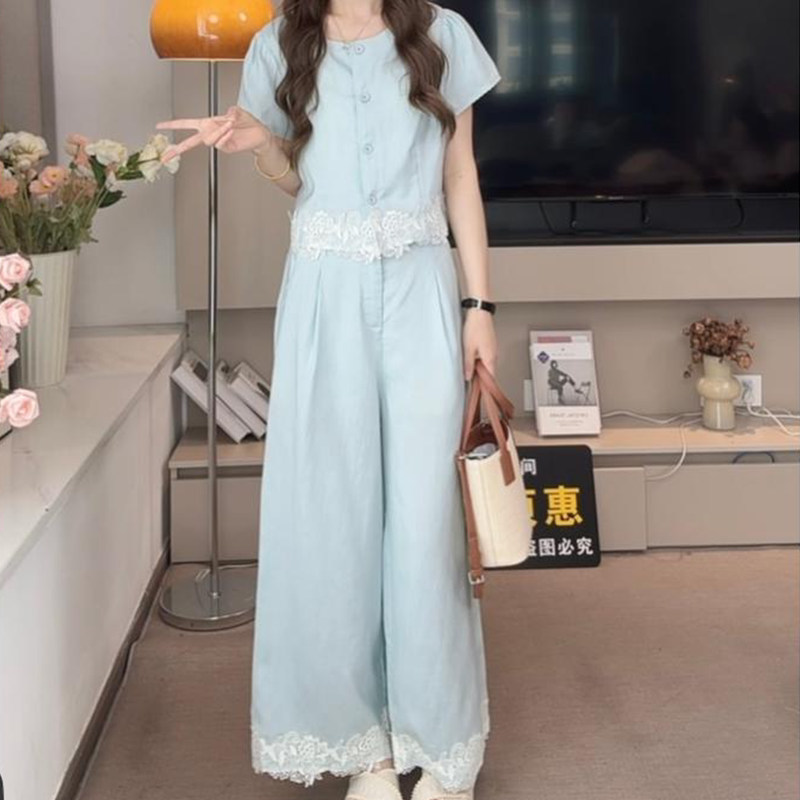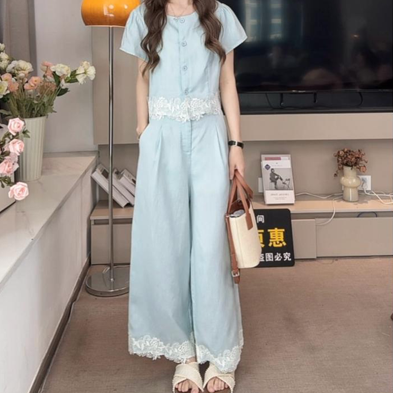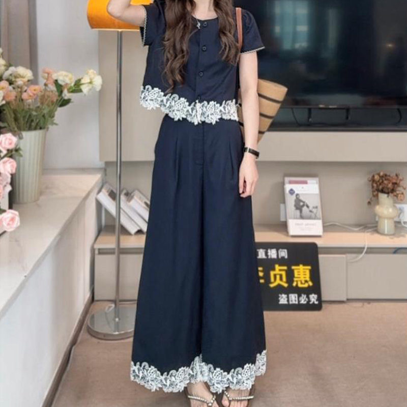 法式复古休闲套装女2026夏季新款时尚气质蕾丝拼接上衣裤子两件套