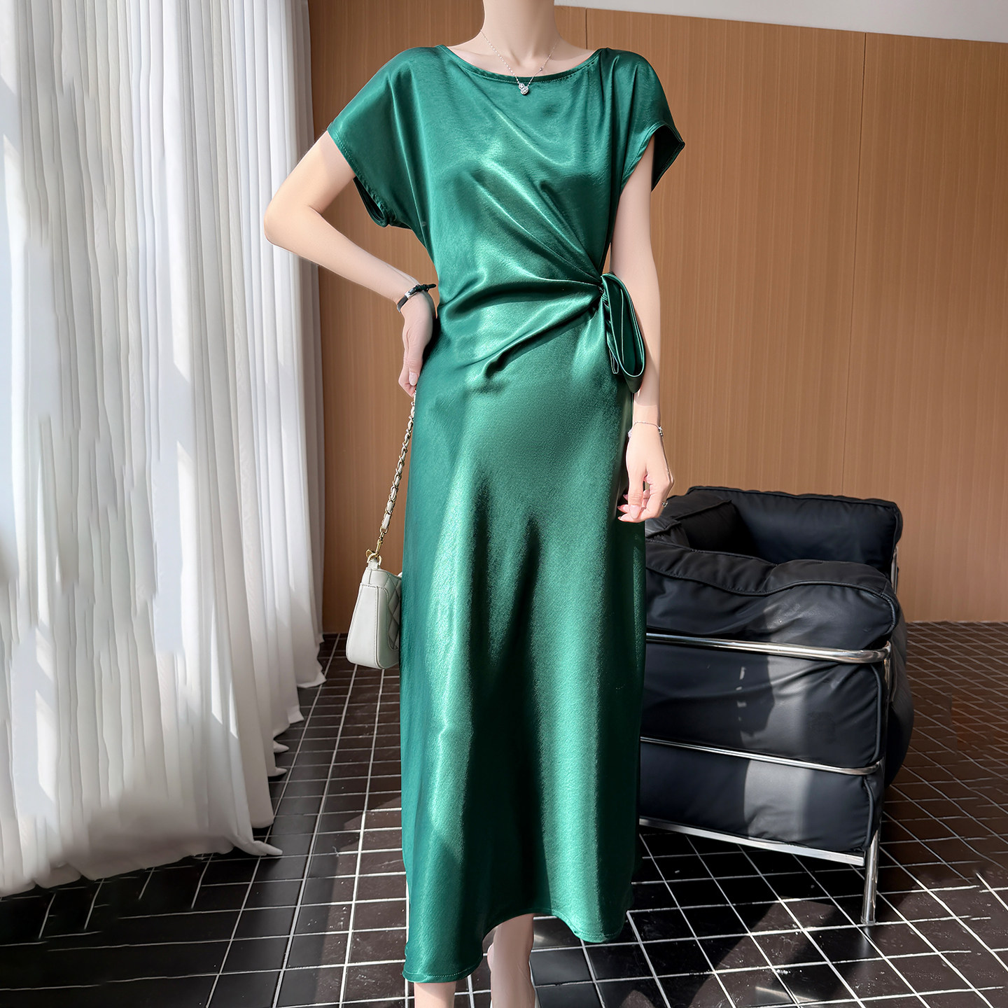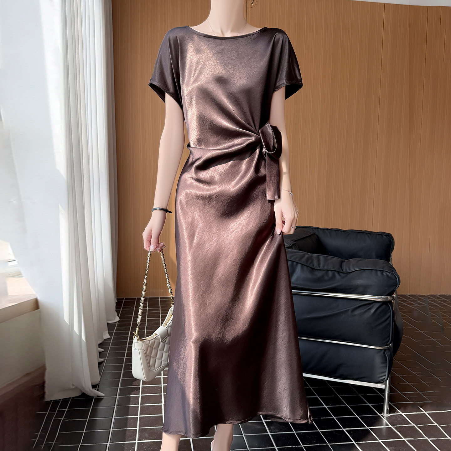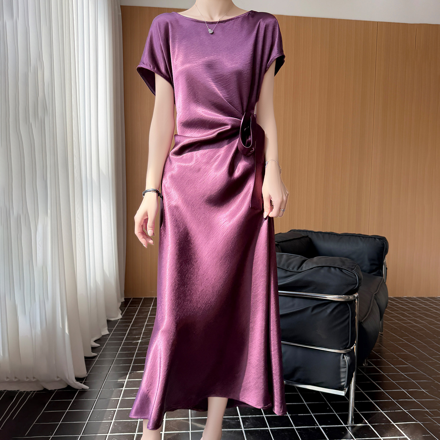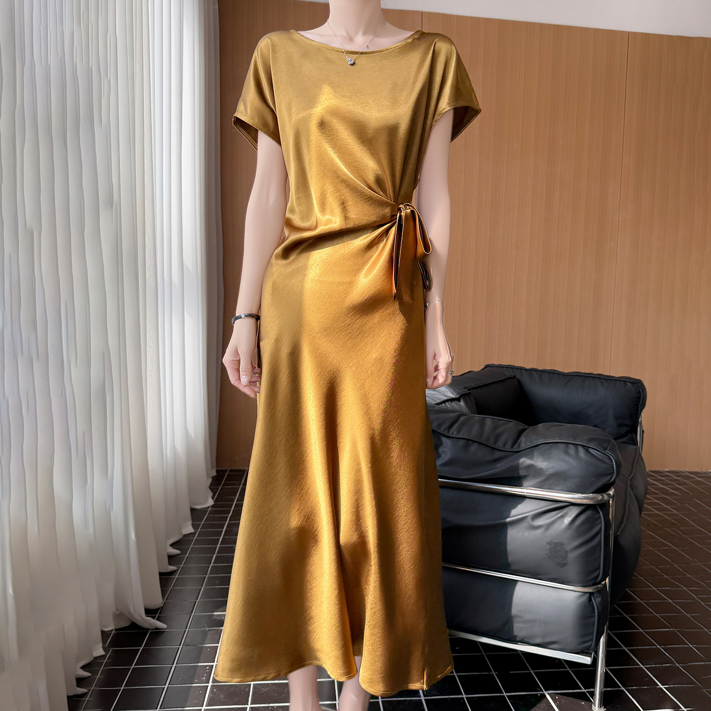 轻奢风缎面连衣裙女系带收腰A字长裙高级感气质裙鎏金短袖拿褶裙