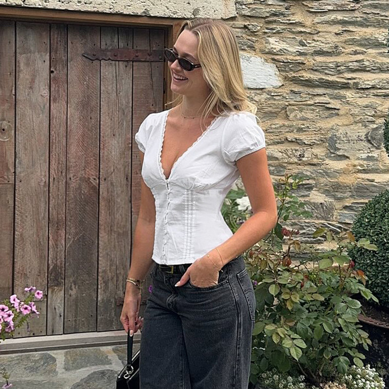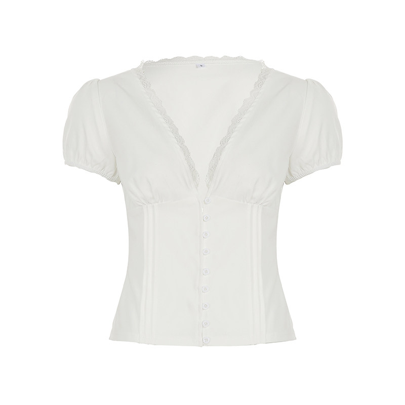 DARLINGAGA法式减龄蕾丝拼接V领泡泡袖衬衫女纽扣束腰修身短上衣