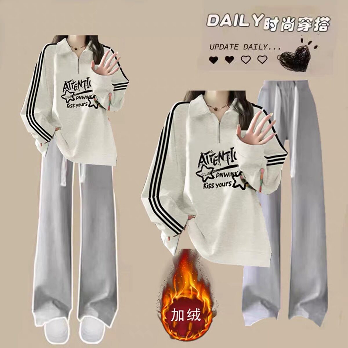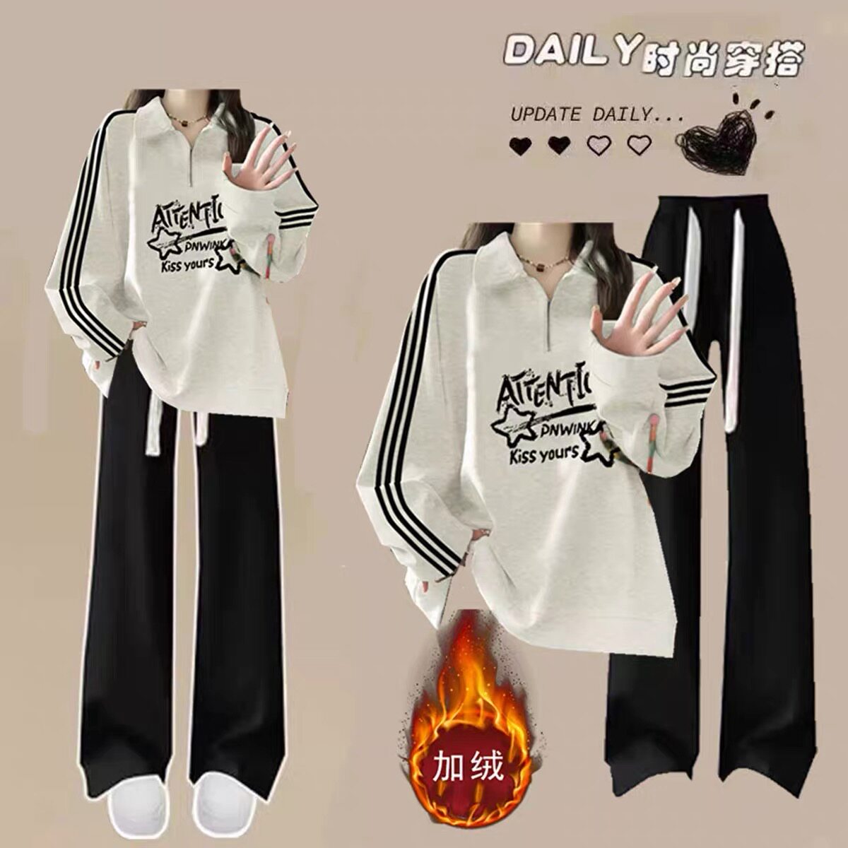 中大童少女套装秋冬季青少年初中学生polo领卫衣加绒阔腿裤两件套