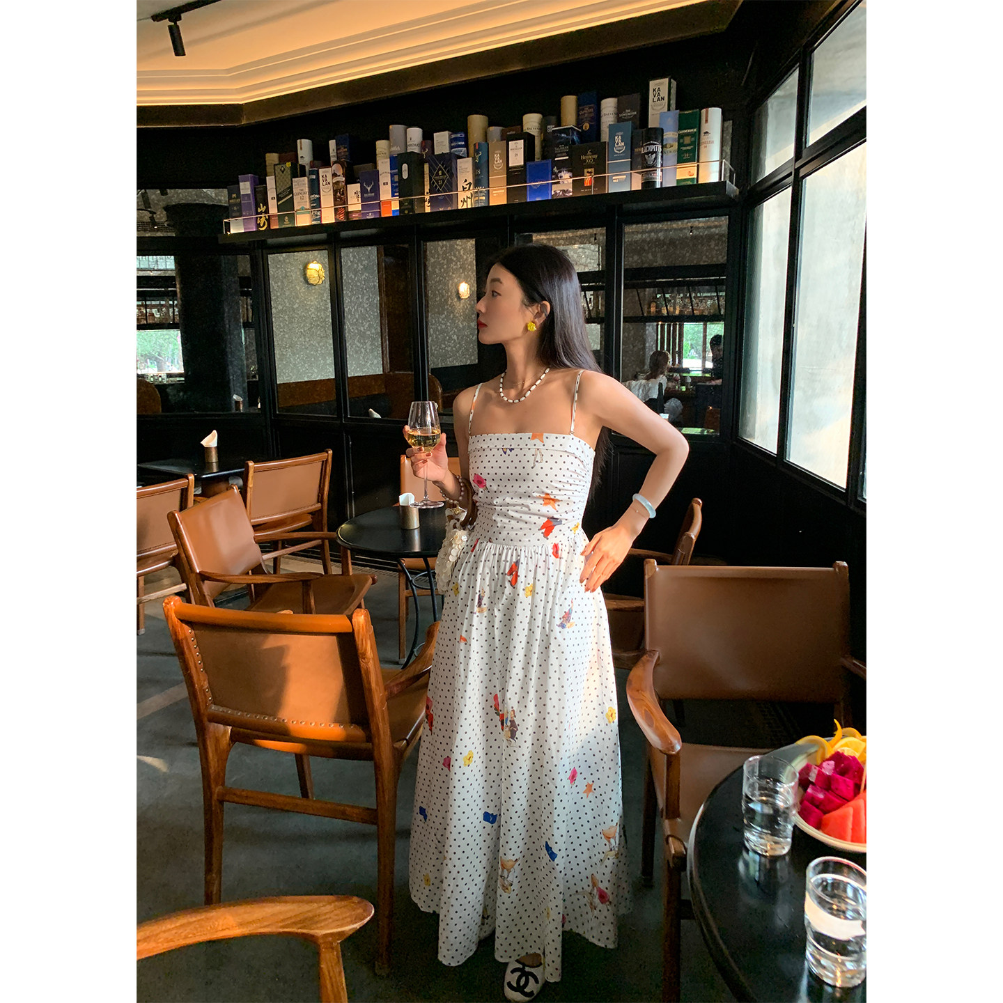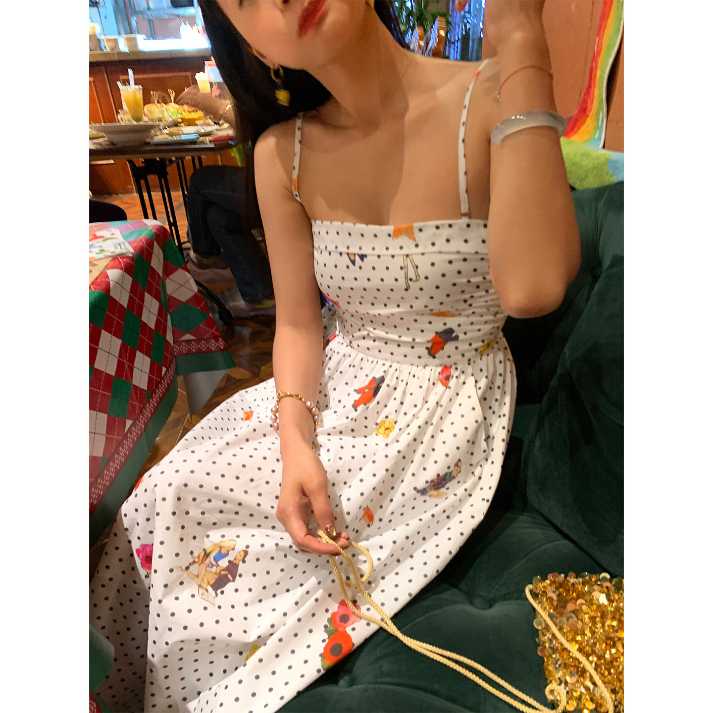 落落狷介 吊带连衣裙女夏波点碎花裙白色小个子收腰吊带裙显瘦裙