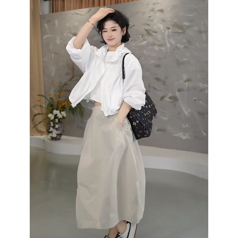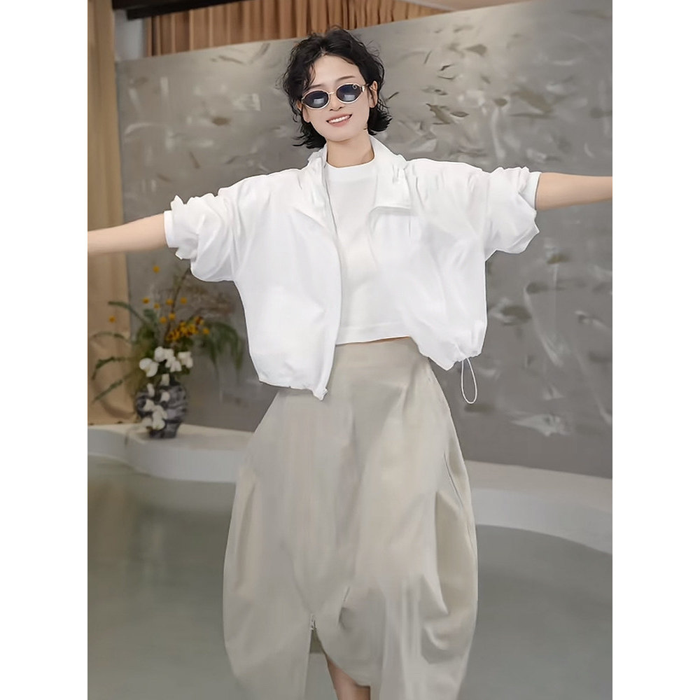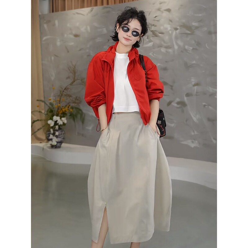 2026春季韩系连帽防晒短外套+拉链花苞半身裙+纯色白T三件套装女