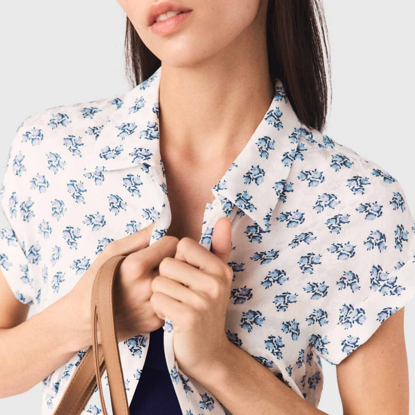 311线报网描述:时尚蓝白花卉图案 翻领短袖收腰设计