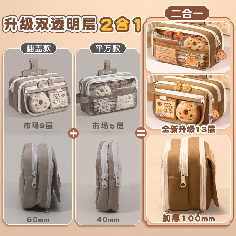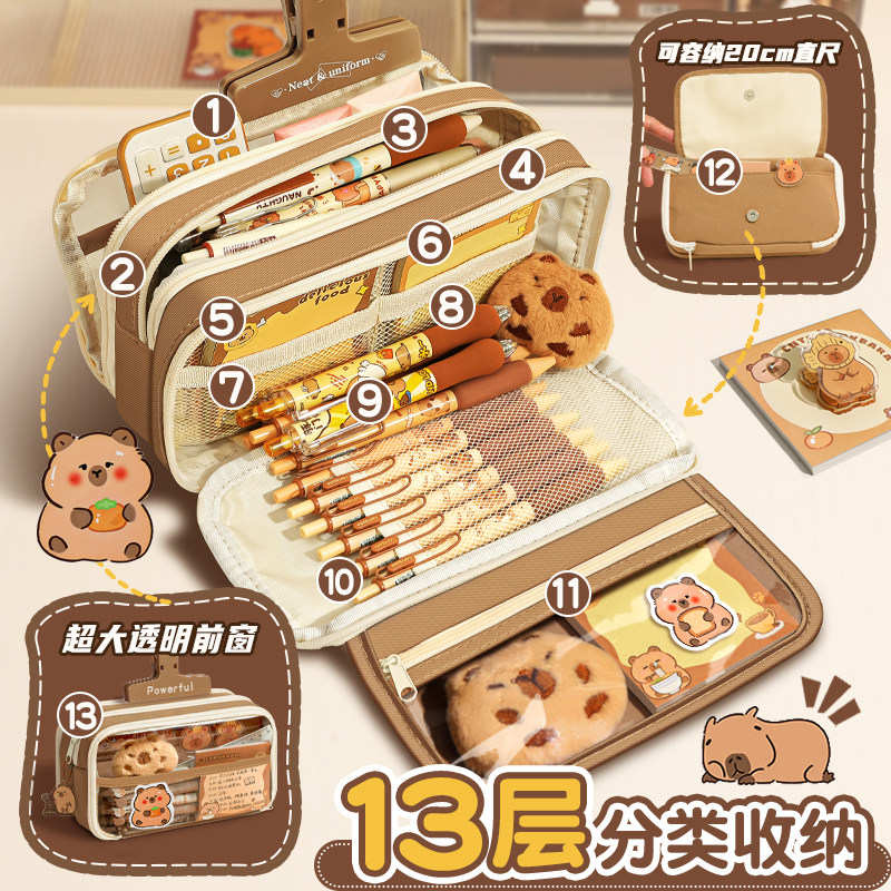 开学大礼包~13层卡皮巴拉大容量笔袋2026新款超火高颜值ins女孩款文具盒女小学生儿童铅笔盒透明男孩文具套装