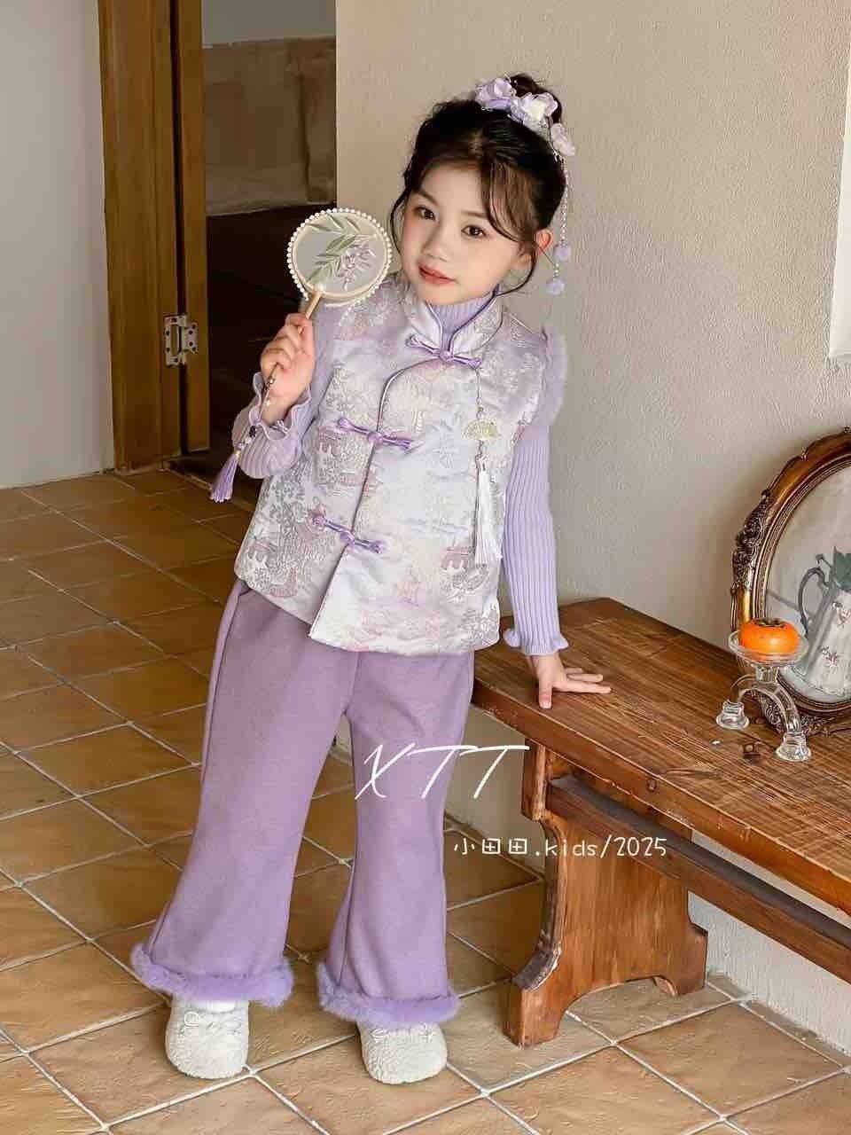 女童旗袍2025新款儿童装中国风唐装古装古风毛衣马甲裤子三件套
