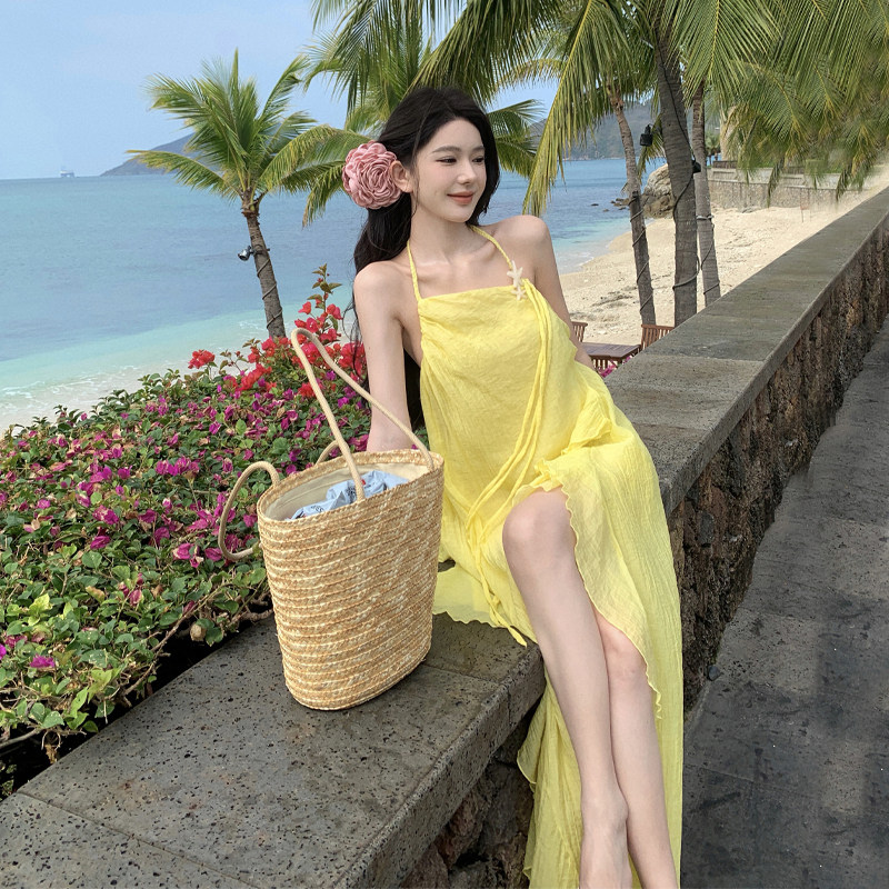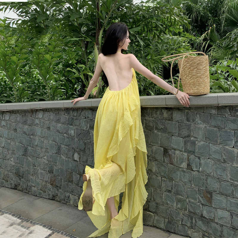 黄色海边度假荷叶边挂脖连衣裙女夏不规则露背开叉吊带长裙沙滩裙