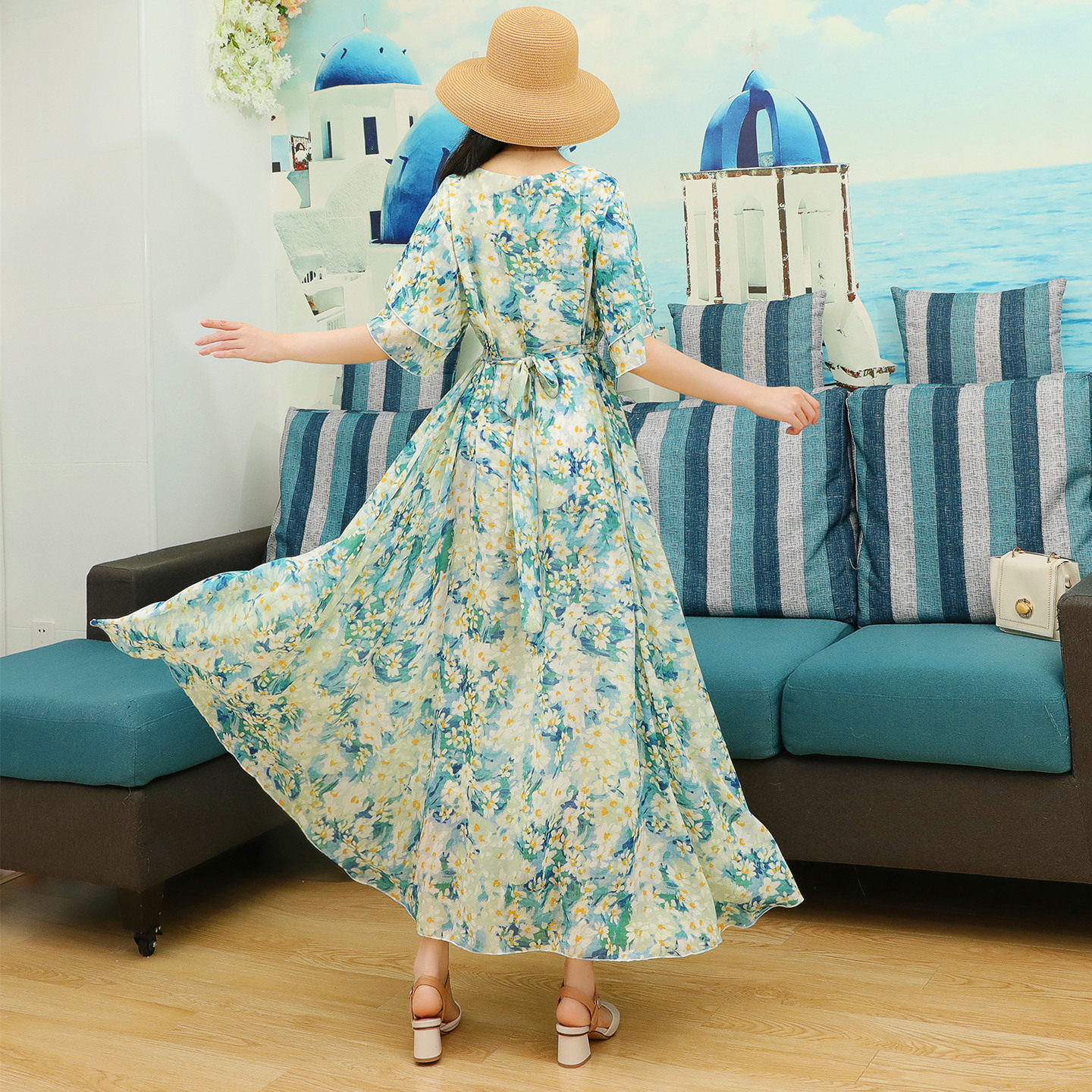法式连衣裙碎花胖mm大码气质夏雪纺长裙海边度假绝美三亚沙滩裙仙