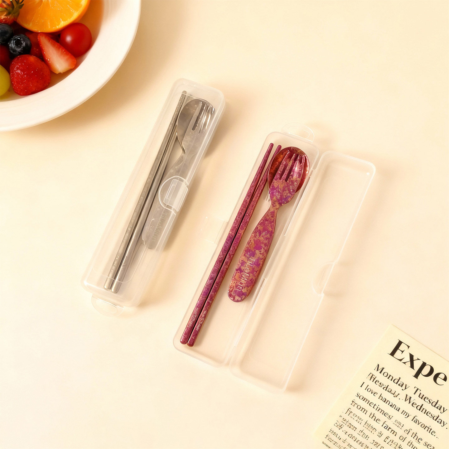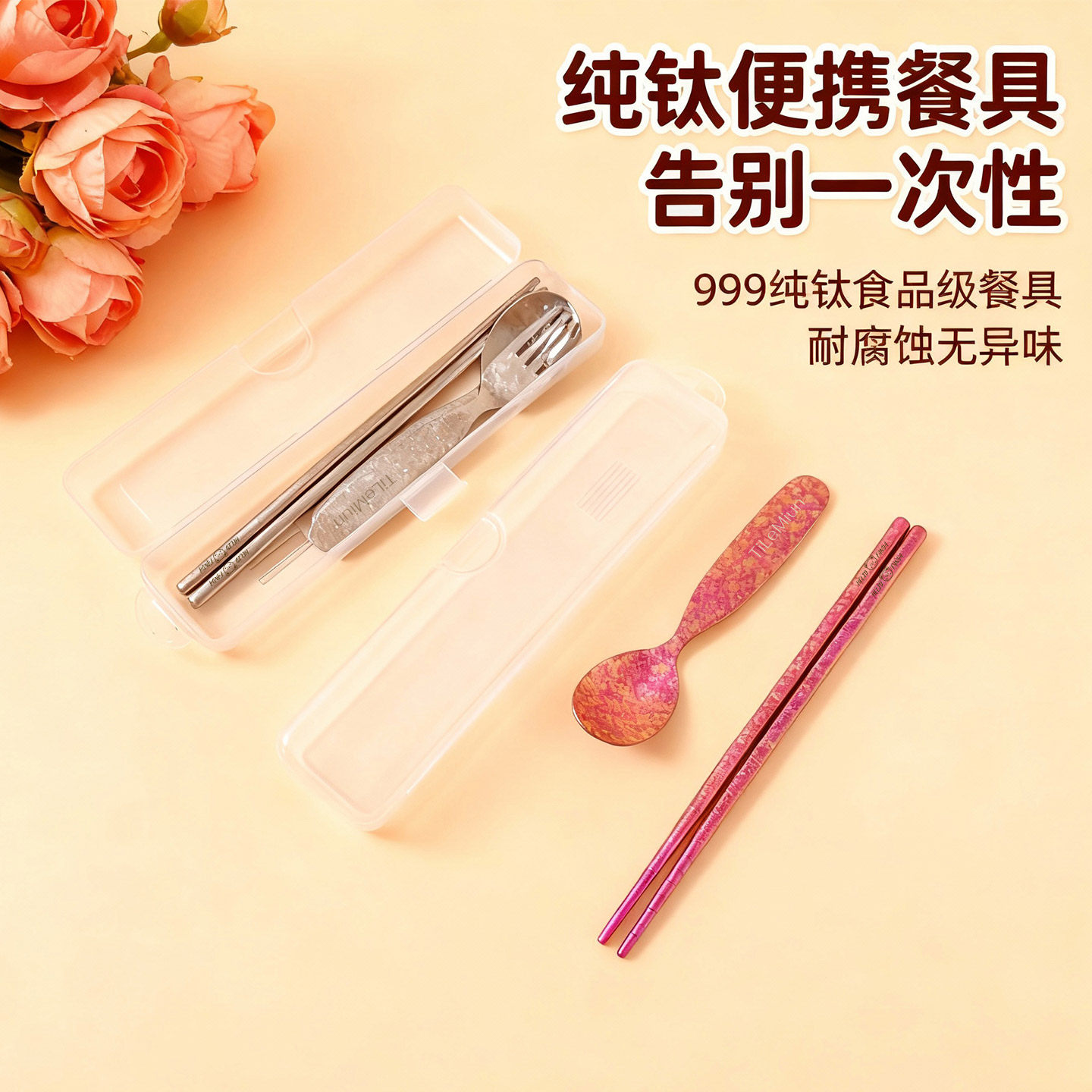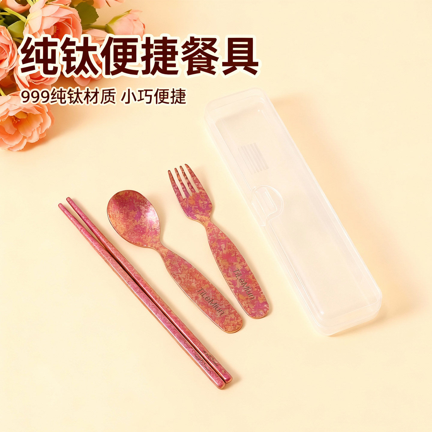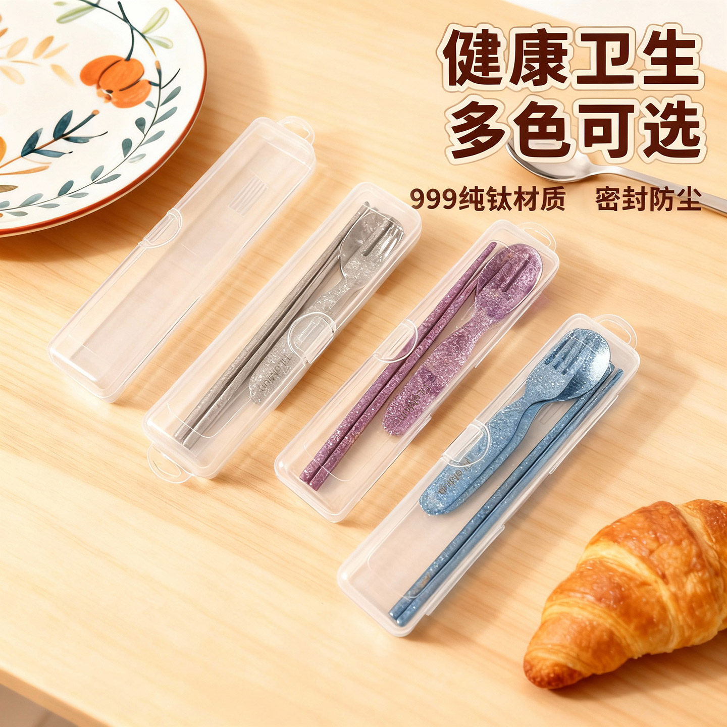 纯钛999筷子勺子套装便携式餐具三件套儿童学生筷勺叉外出收纳盒