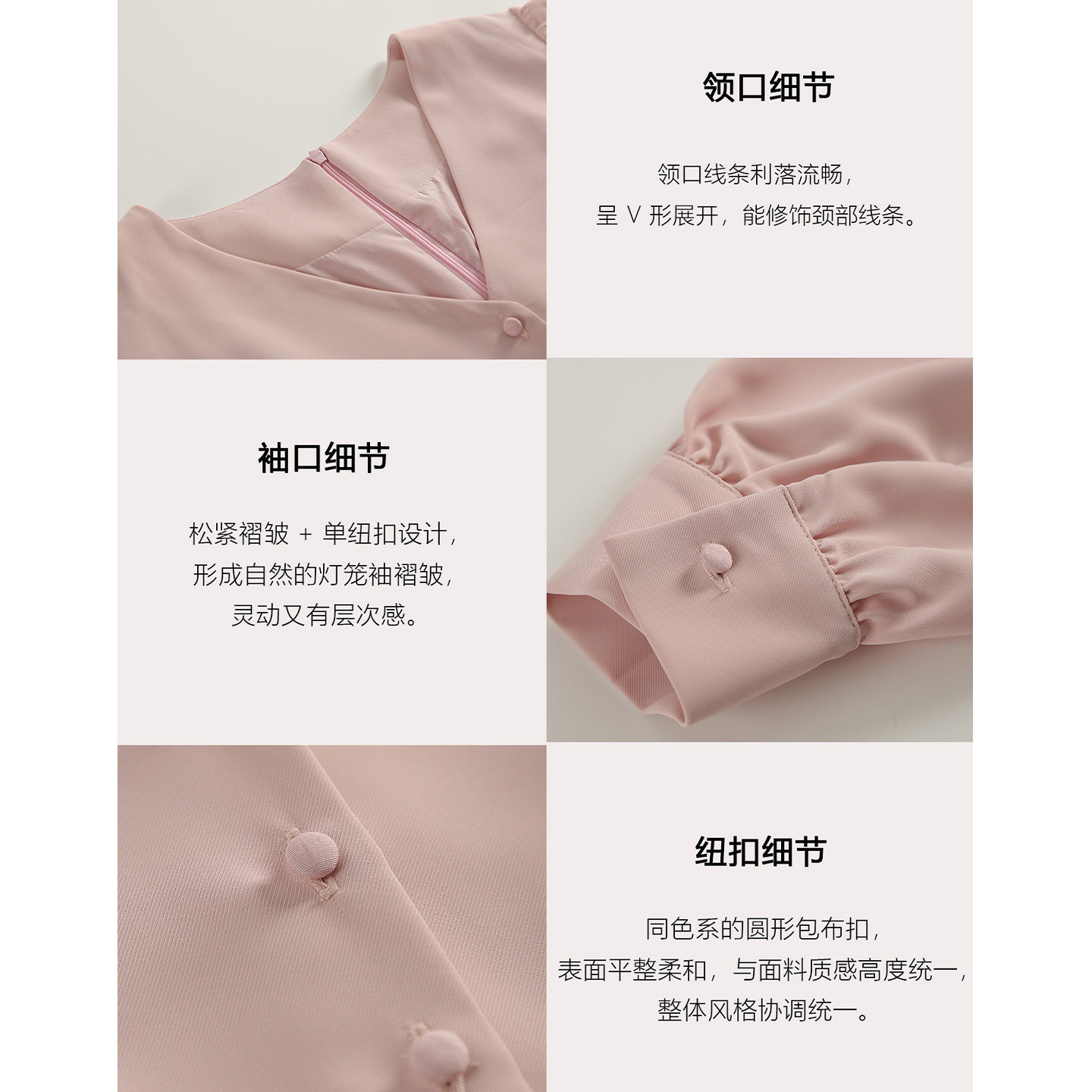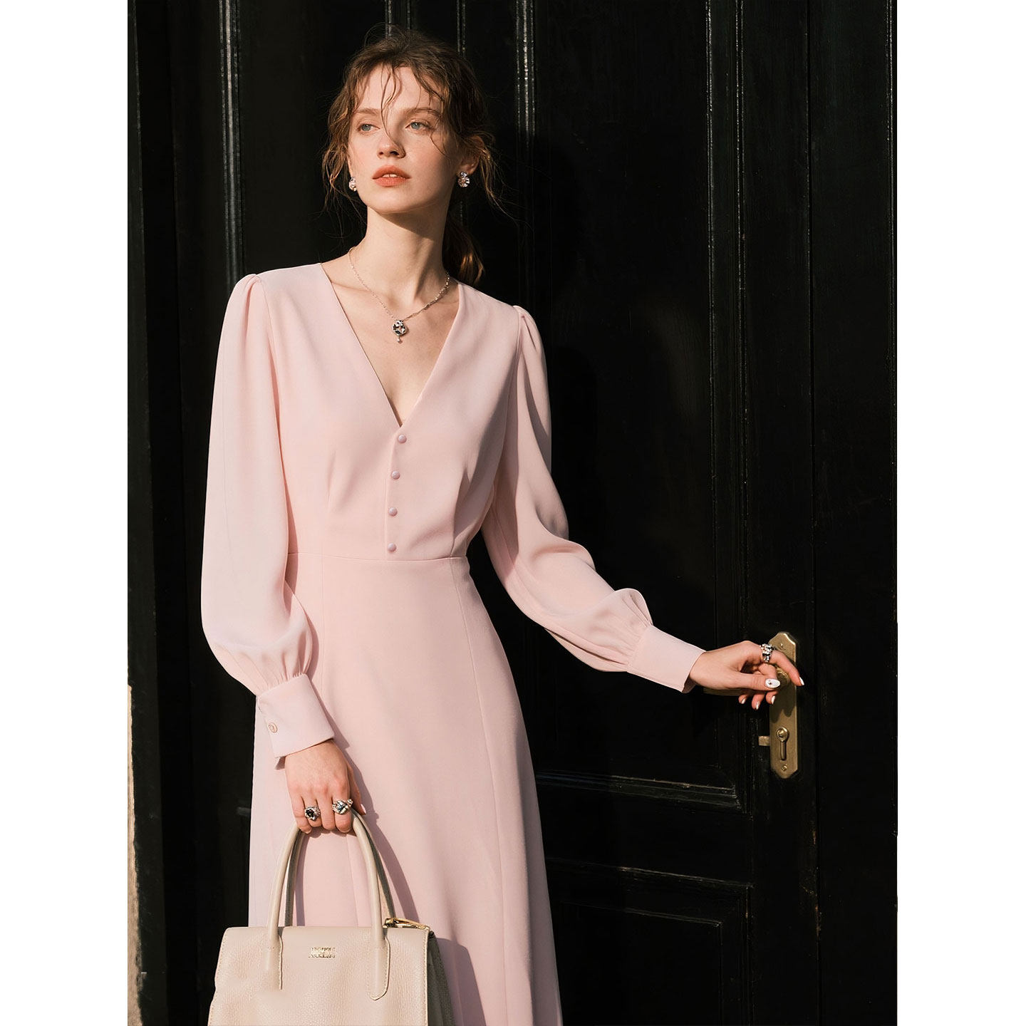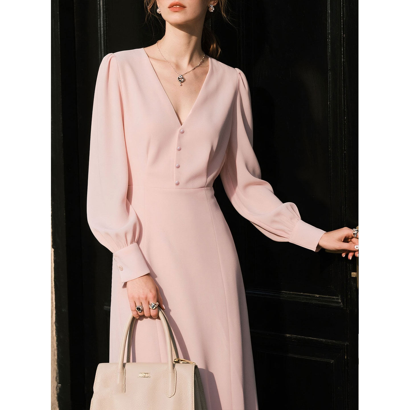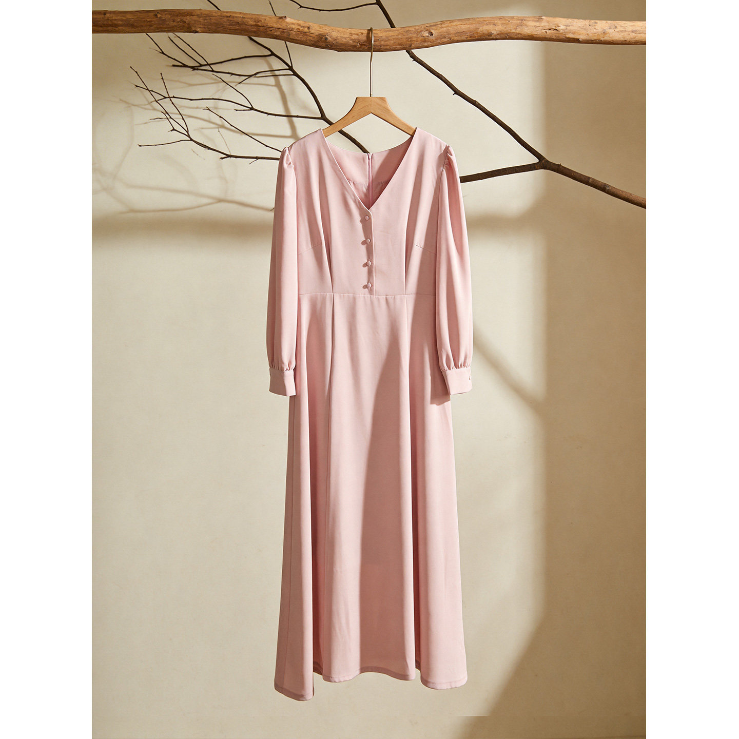 粉色V领长袖连衣裙女2026年春季新款温柔风气质收腰显瘦包臀裙子