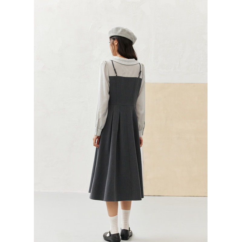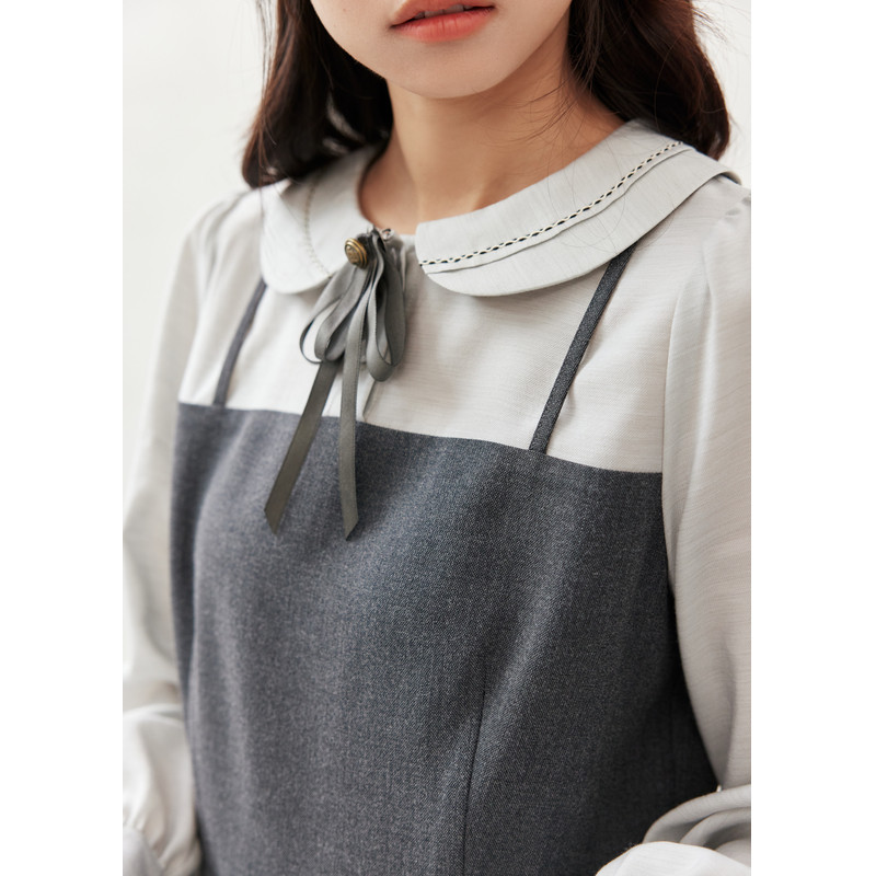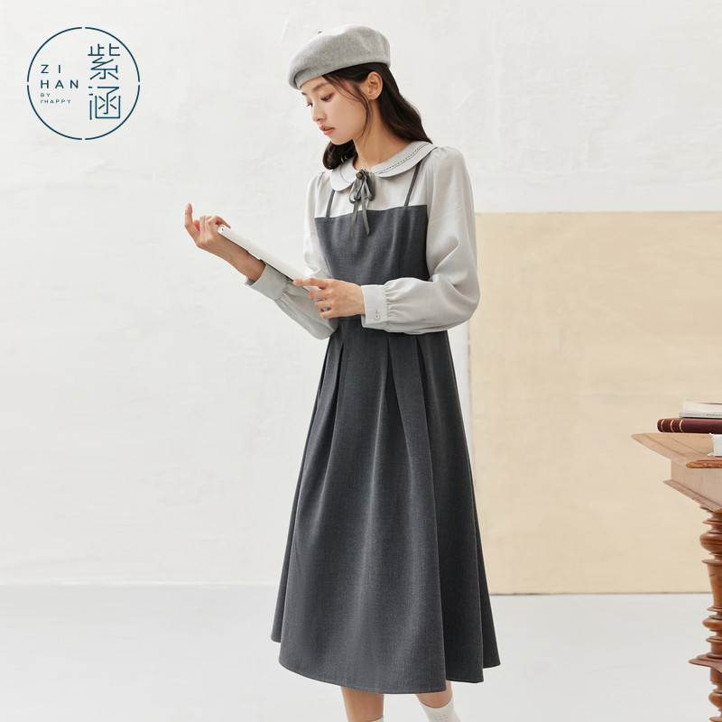 紫涵假两件翻领长袖连衣裙女2026春季新款文艺气质收腰显瘦a字裙