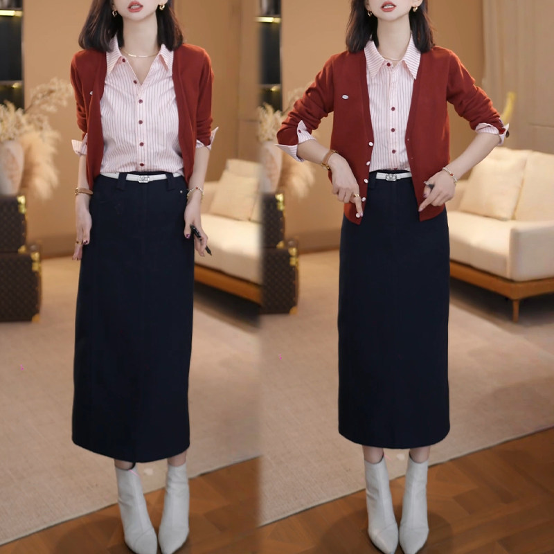 巨好看的两件套早春2026新款假两件条纹拼接长袖针织衫半身裙套装