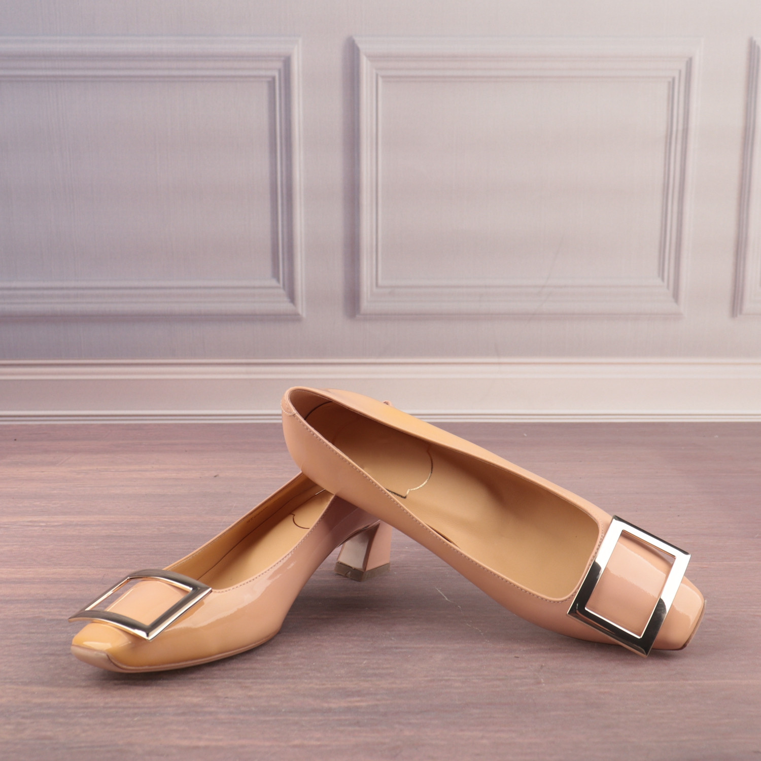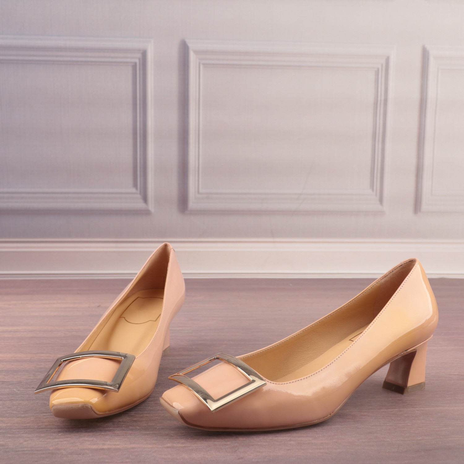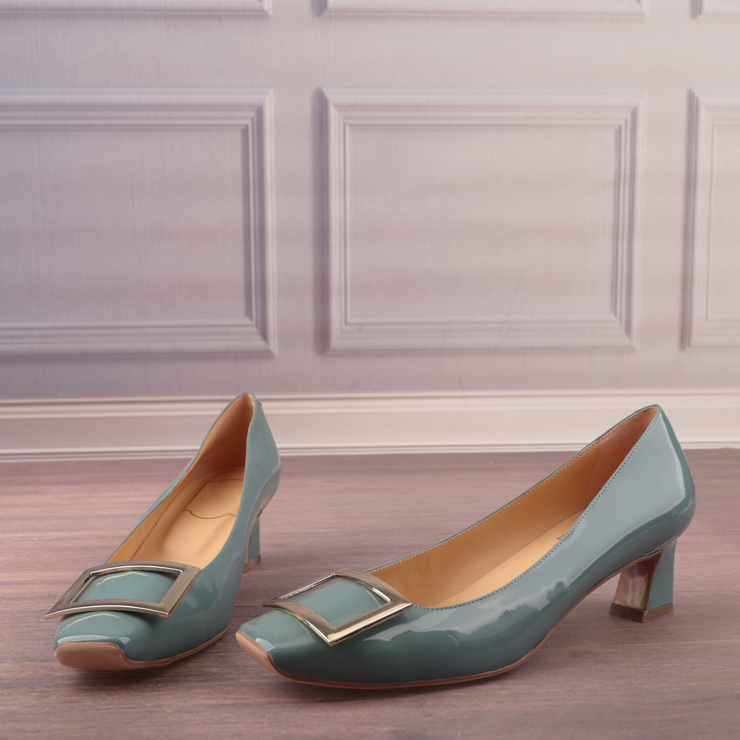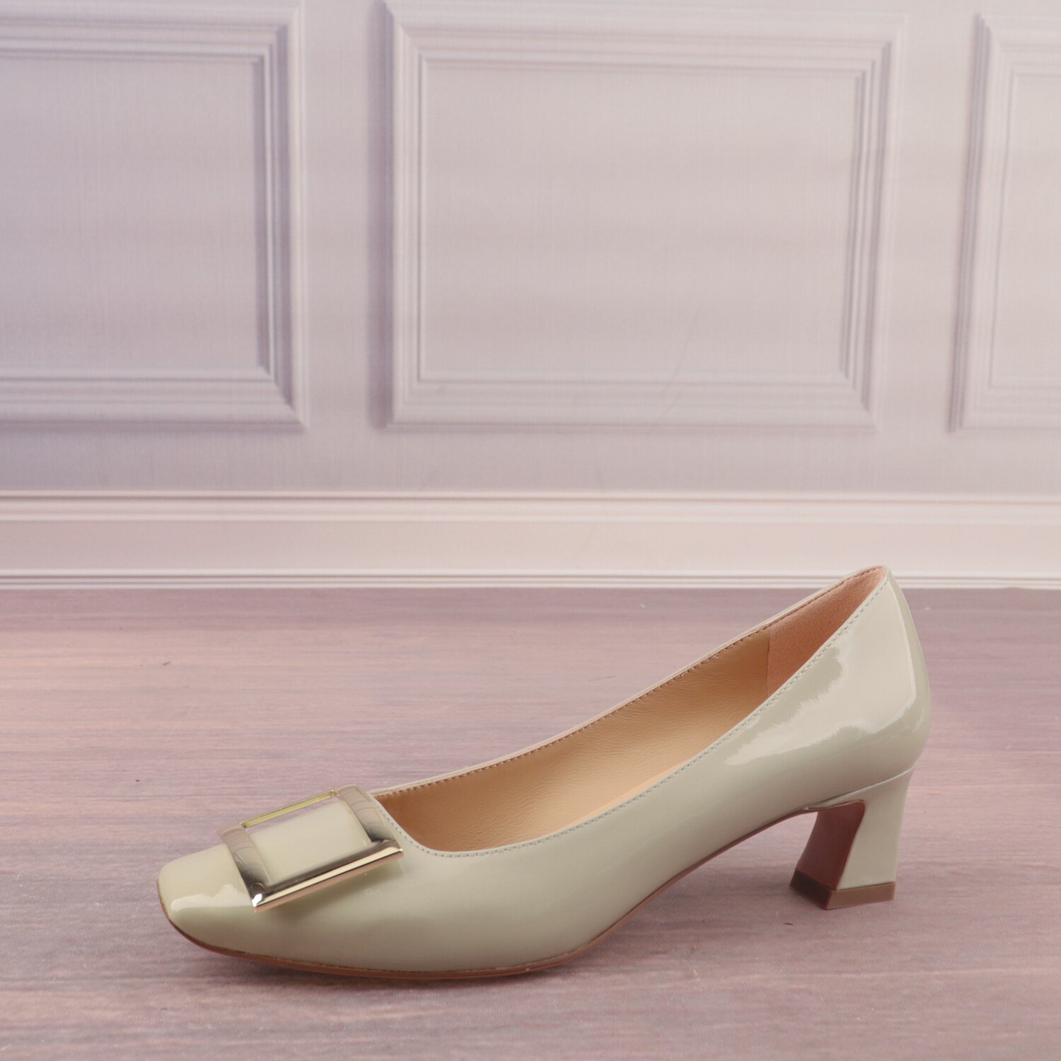 金属扣方头中跟牛漆皮面羊皮里真皮女鞋子百搭职业浅口单鞋X11-3