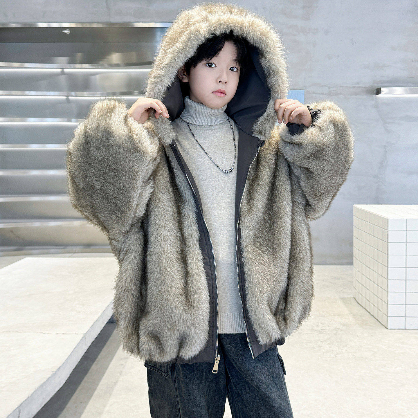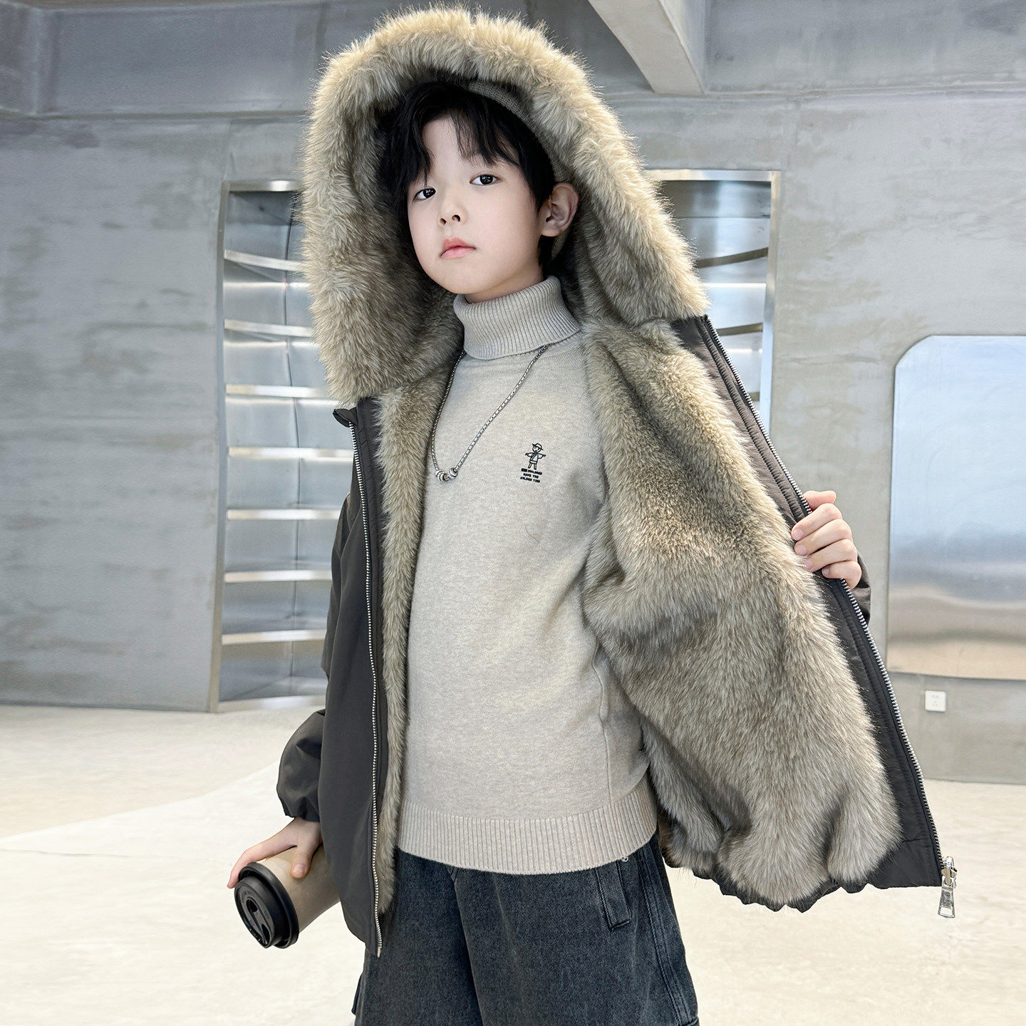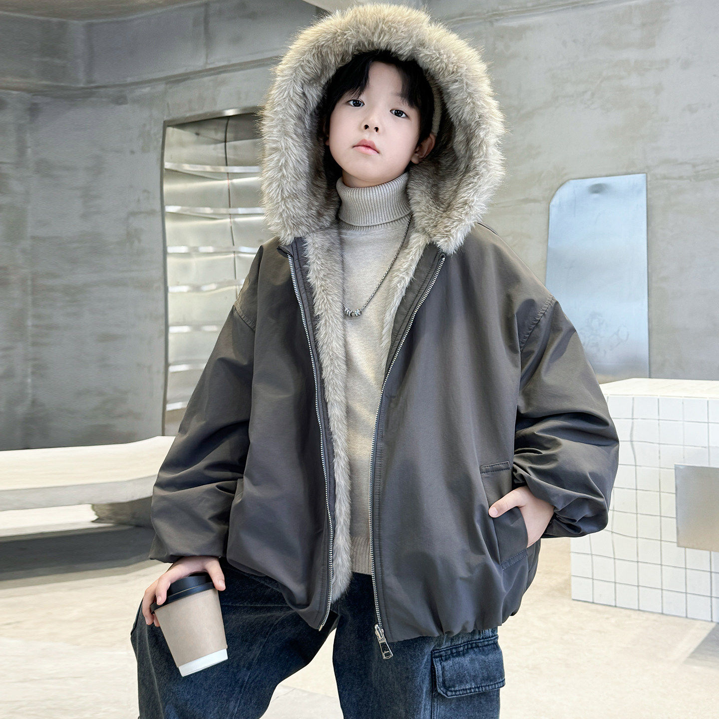 男童冬装加绒外套2026新款冬季男孩毛皮一体中大儿童秋冬款加厚潮