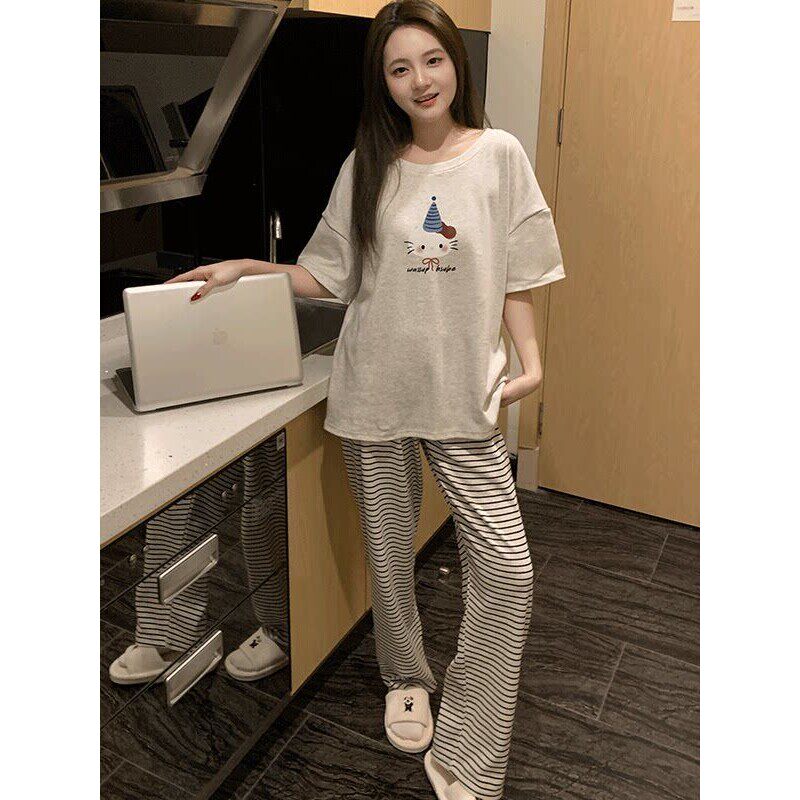 睡衣青少年女初中学生纯棉睡衣短袖长裤卡通条纹高中初中生家居服