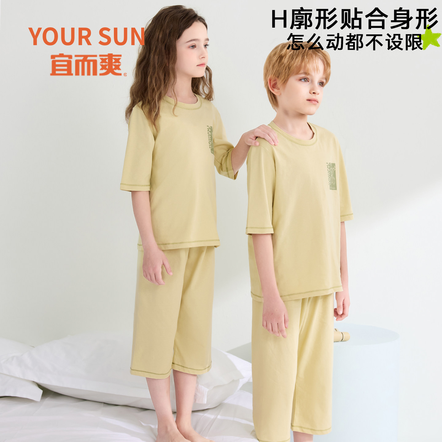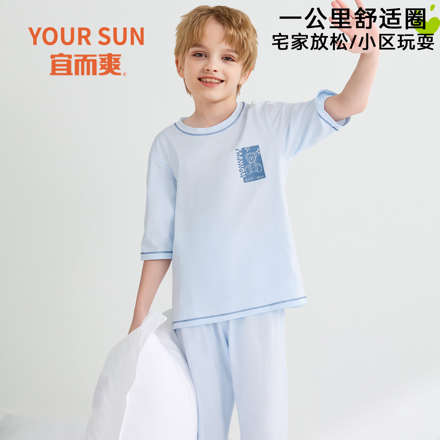 宜而爽儿童睡衣纯棉男童七分袖全棉女孩中大童青少年空调家居服夏