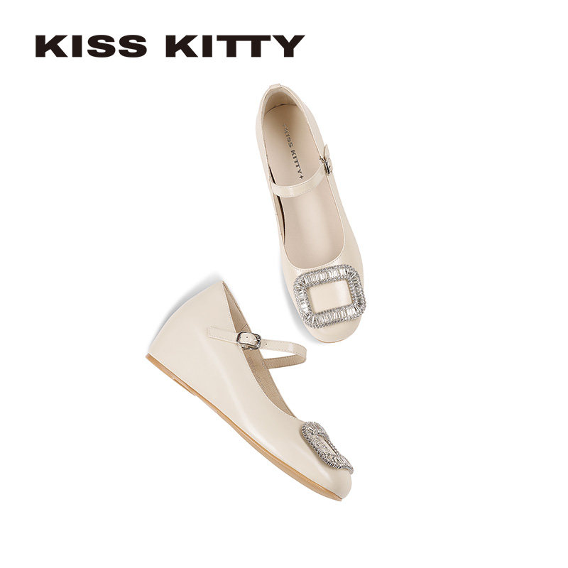 KISSKITTY一字带玛丽珍鞋女2026春款内增高水钻方扣平底浅口单鞋
