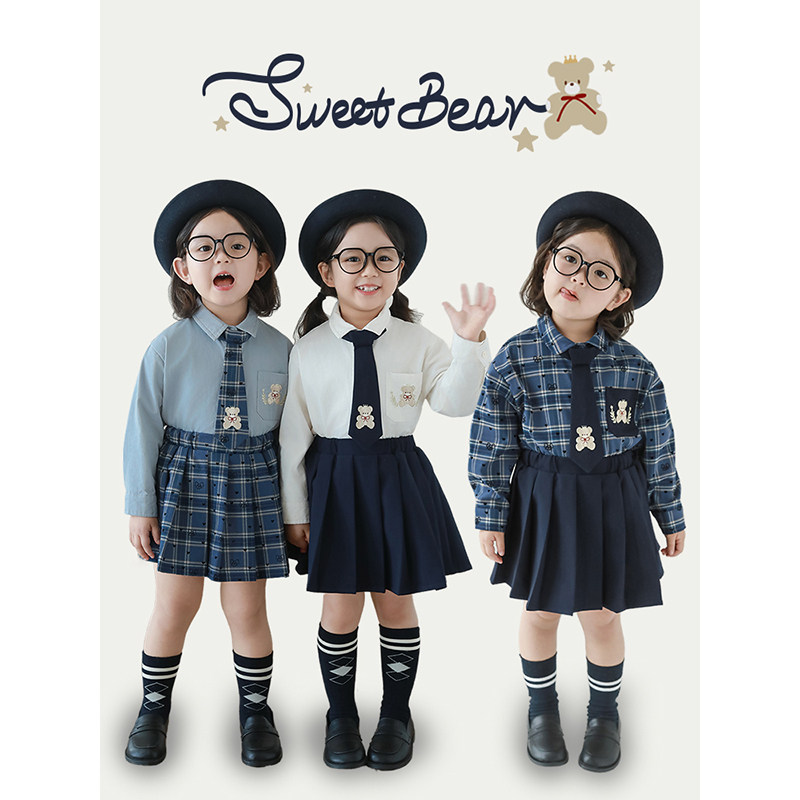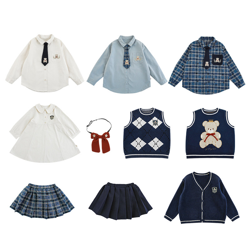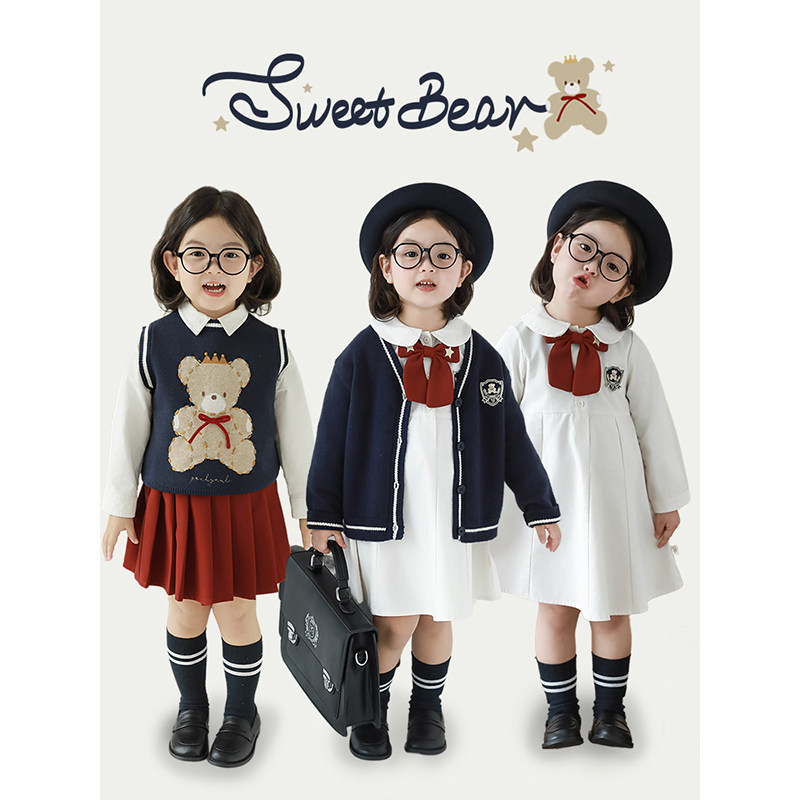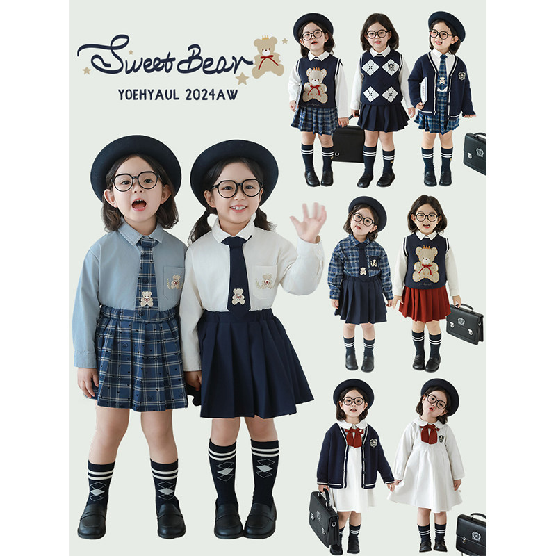 幼悠女童学院风系列春秋菱格提花毛衣马甲娃娃翻领衬衫白裙多件套