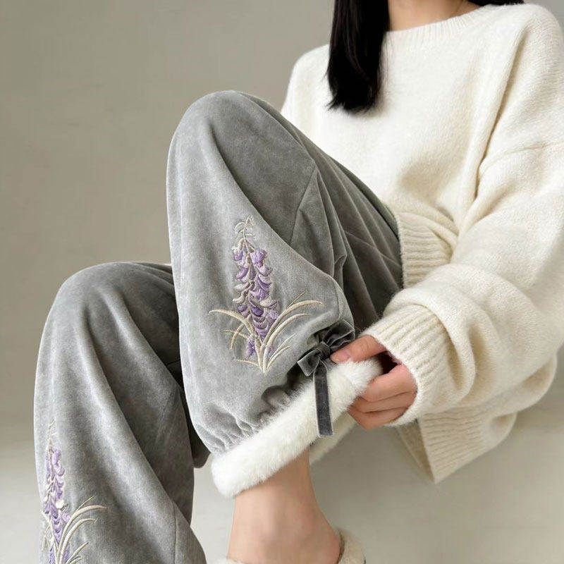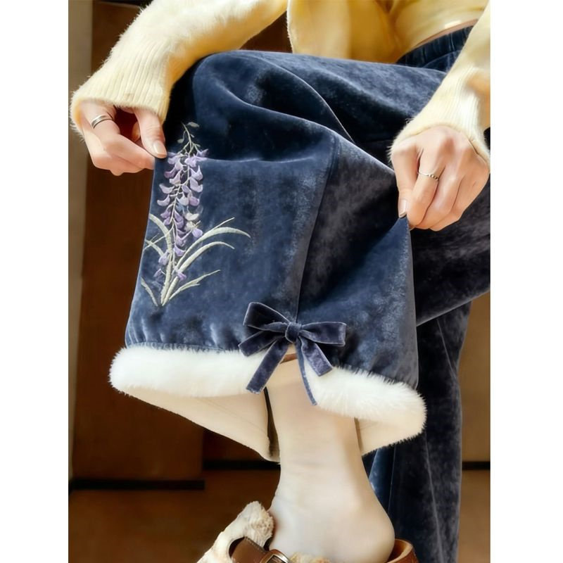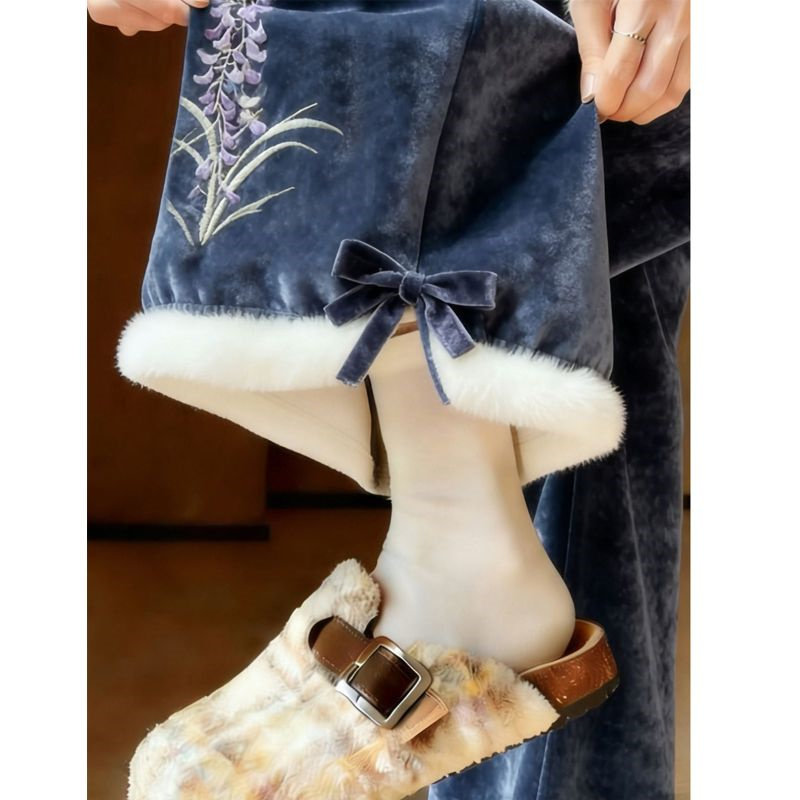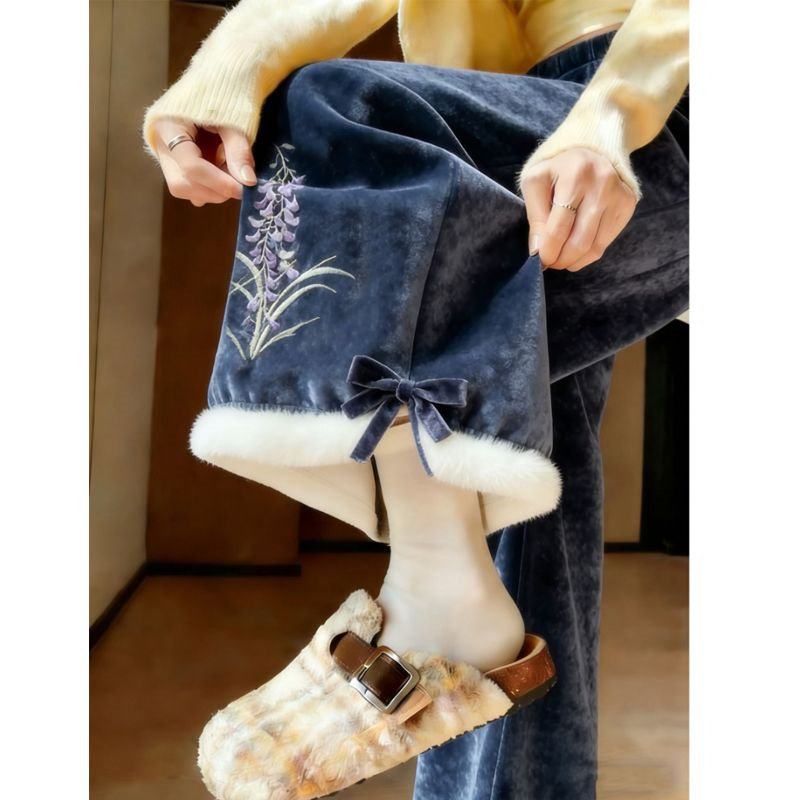 新中式国风丝绒裤子2026新款今年流行爆款加厚加绒刺绣毛边阔腿裤