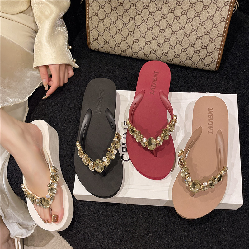 2025夏季高级感水钻人字拖女外穿坡跟时尚5厘米中跟防滑沙滩凉鞋