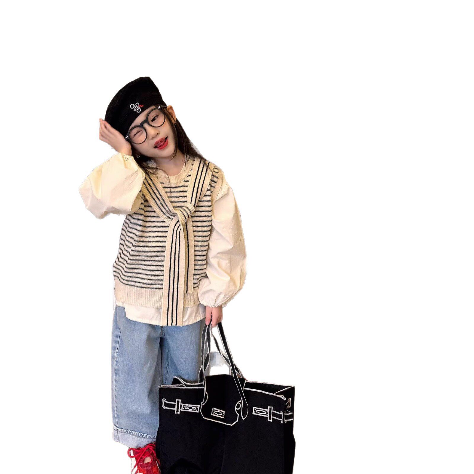 女童春季套装披肩毛衣针织马甲韩版圆领条纹背心衬衫两件套潮套装