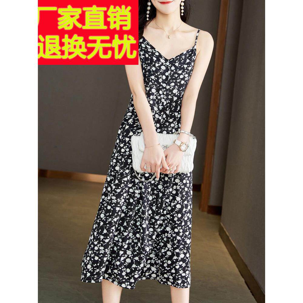 2025全新夏季V领雪纺薄吊带连衣裙覆古碎花中长覆盖肉的女士裙