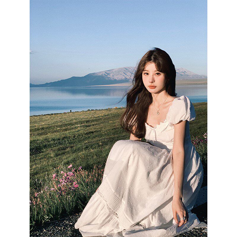VASSE美蟹 法式复古连衣裙子女夏季小个子气质海边度假裙白色长裙