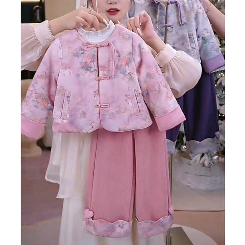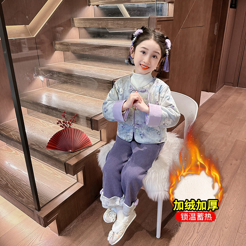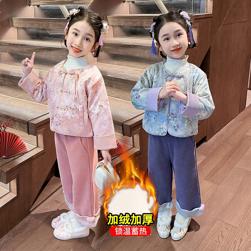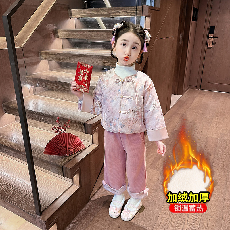 2025女童春秋季套装抖音爆款国风唐装盘扣夹棉外套加绒裤子两件套