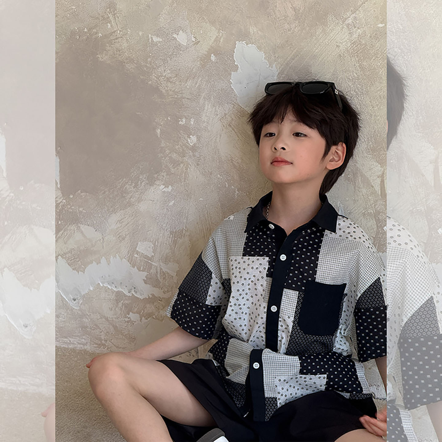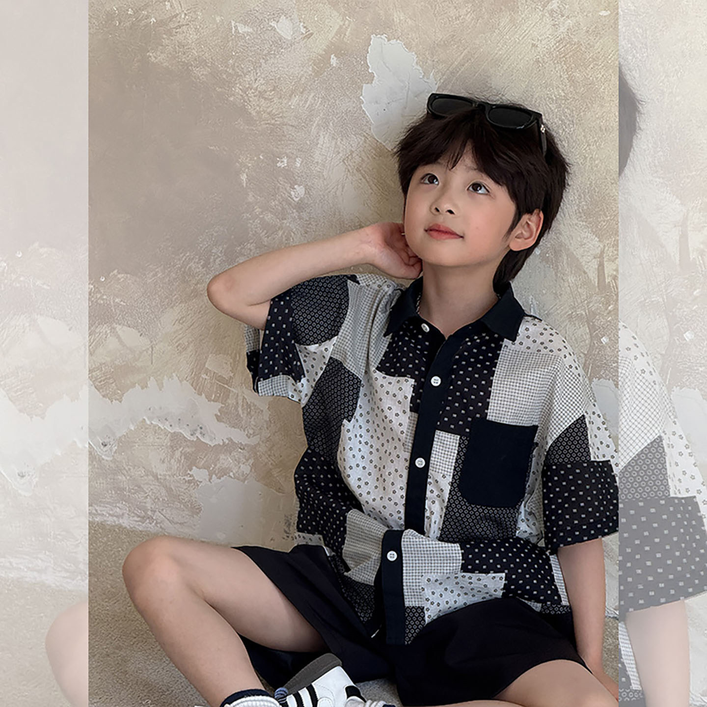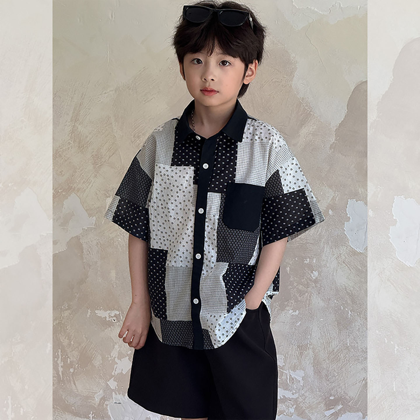 虾酱麻麻男童短袖衬衫套装夏季2026新款上衣纯棉撞色格子儿童裤子