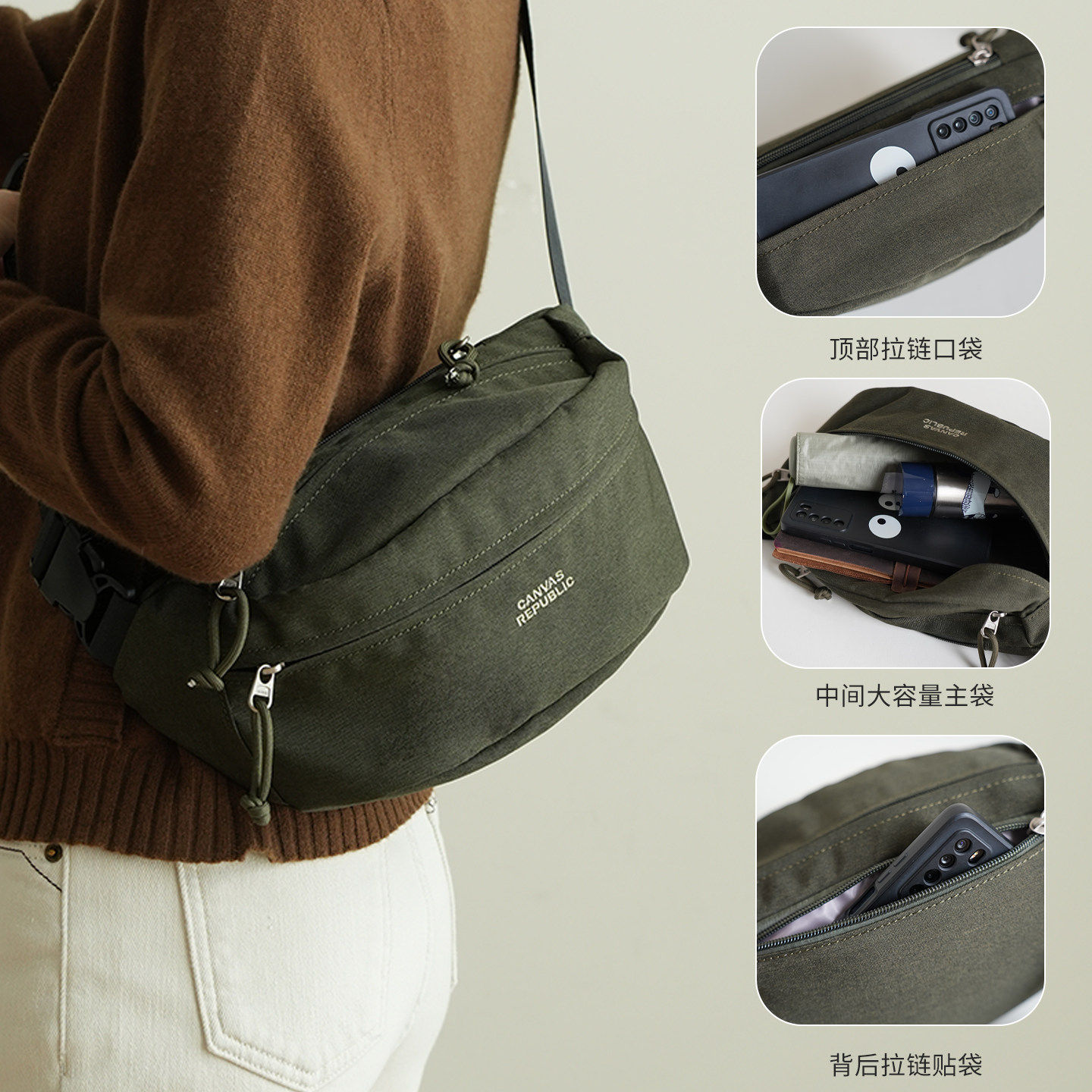 防泼水 帆布大容量宽肩带胸包 简约纯色可调节单肩斜挎包k
